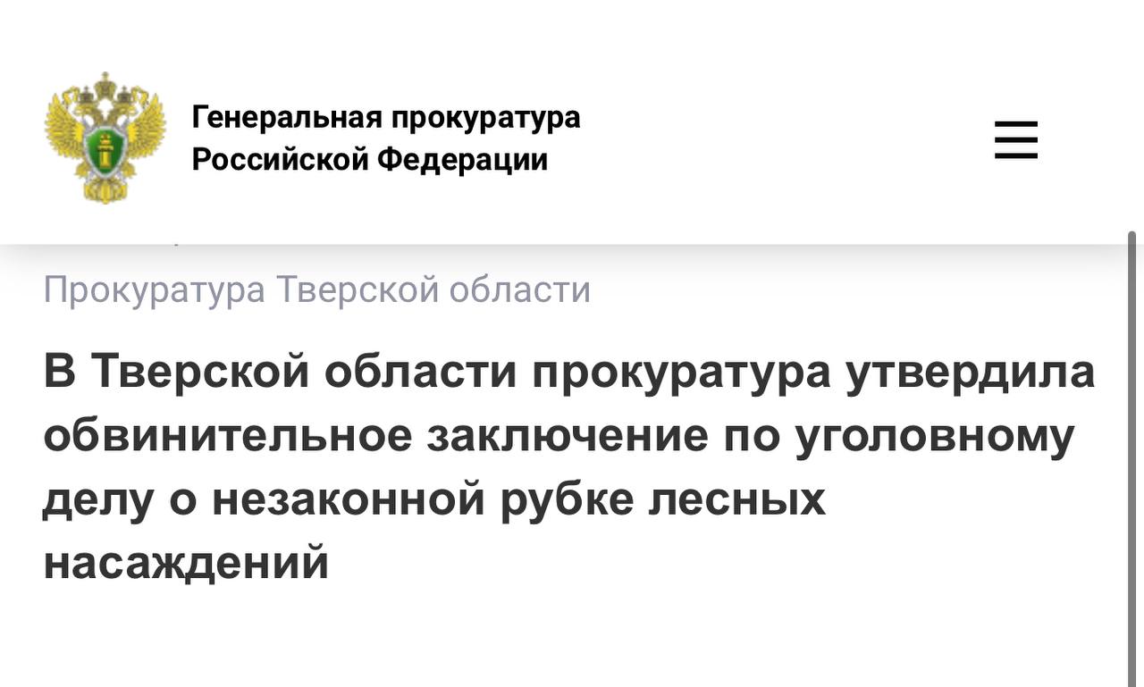 Осташковская межрайонная прокуратура утвердила обвинительное заключение по уголовному делу в отношении двоих местных жителей и жителя г. Москвы. Они обвиняются по ч. 3 ст. 260 УК РФ (незаконная рубка лесных насаждений в особо крупном размере).