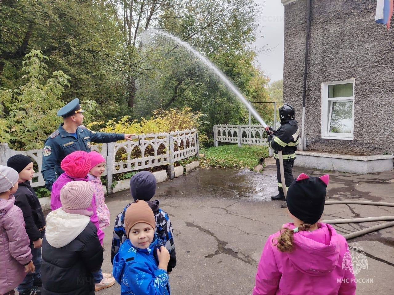 Детям рассказали о работе пожарных, средствах пожаротушения и правилах поведения при пожарах. Показали пожарную машину, инструменты и экипировку. Малыши попробовали надеть боевую одежду и посидеть за рулем авто. Под руководством сотрудников дети даже подавали воду из пожарного ствола.