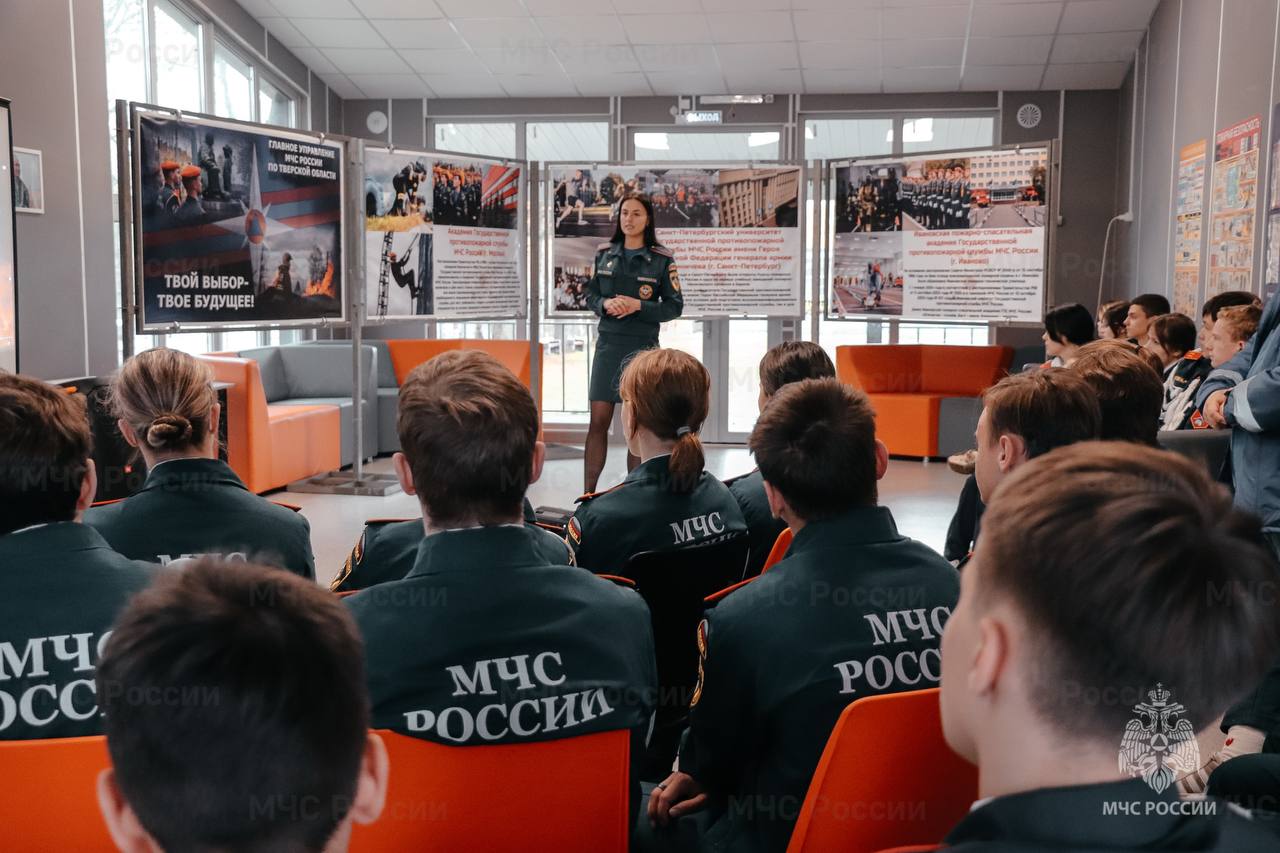 Для учеников была организована агитационная кампания с передвижной фотовыставкой. Сотрудники продемонстрировали показательные видеоролики, рассказывающие об этапах становления и развитии МЧС России, о службах, которые входят в состав ведомства и о современной деятельности Министерства. Сотрудники ответили на вопросы о поступлении в учебные заведения ведомства, а также поделились личным опытом о том, как сами проходили обучение в ВУЗах МЧС России.