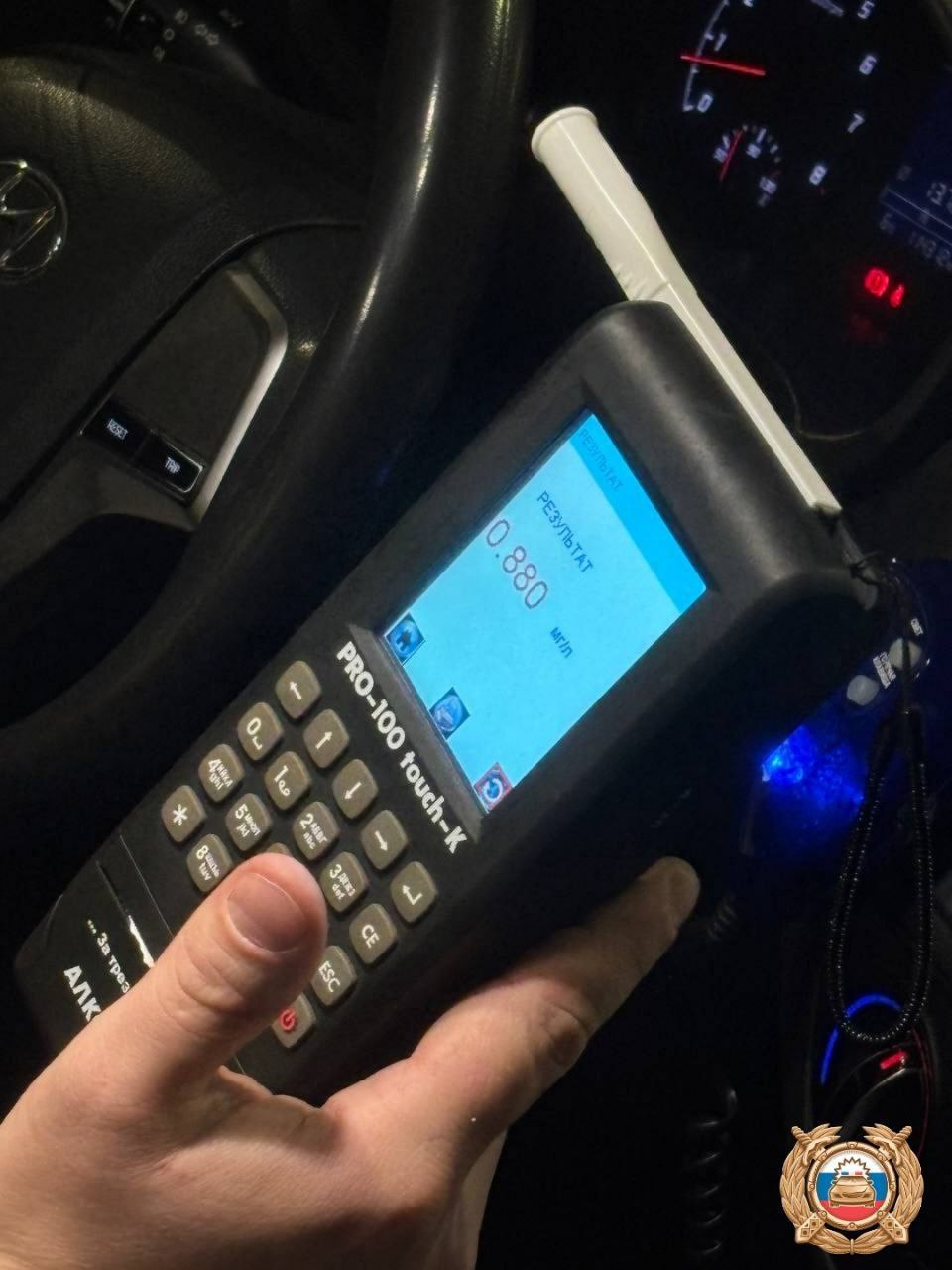 На месте сотрудниками Госавтоинспекции было проведено освидетельствование на состояние опьянения, по результатам которого было установлено состояние опьянения, прибор показал 0.880 мг/л на литр выдыхаемого воздуха. В отношении водителя был составлен административный материал по ч. 3 ст. 12.8 КоАП РФ (Управление транспортным средством водителем, находящимся в состоянии опьянения и не имеющим права управления транспортными средствами). Водитель был отстранен от управления ТС и доставлен в Центральный ОП. Суд назначил административное наказание в виде ареста на срок 10 суток.