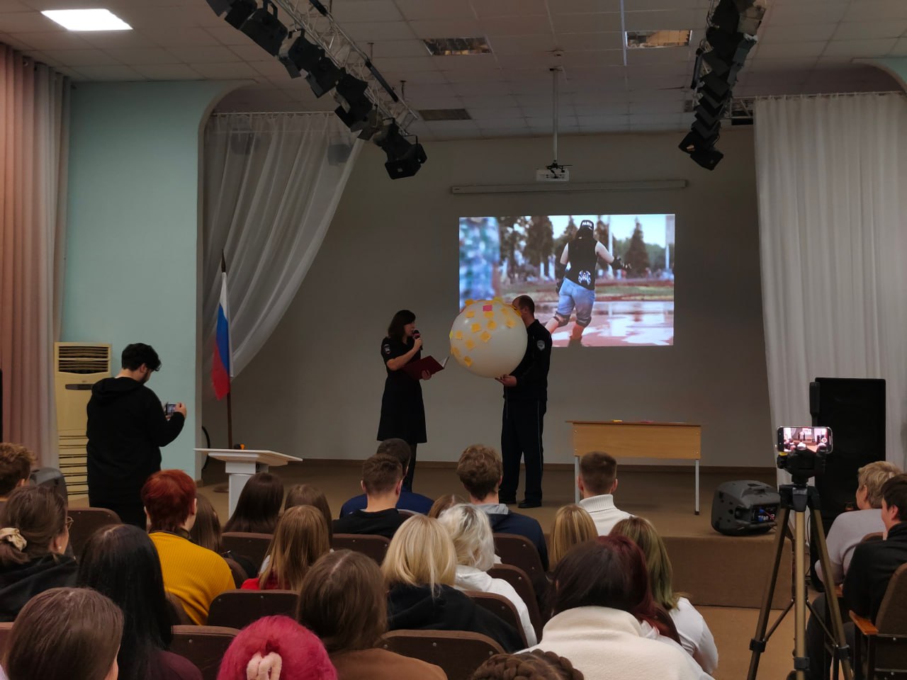 Присутствующим был продемонстрирован специально подготовленный видеоряд, состоящий из подборки сюжетов с мест дорожных аварий, в которых погибли и получили тяжелые ранения люди. Инспектор по пропаганде БДД Аверьянова Татьяна обратила внимание молодых людей на то, что фрагменты резонансных происшествий врезаются в память на всю жизнь, особенно если в них пострадали дети. Она напомнила, что, если игнорировать Правила дорожного движения, все желания и мечты в одно мгновенье могут лопнуть, как воздушный шар, и призвала молодежь быть внимательными и осторожными на дорогах. Начальник отряда поисковых аварийно -спасательных работ Струнин Юрий на примере собственного опыта рассказал, как спасает пострадавших в ДТП и как у него на глазах умирали люди.