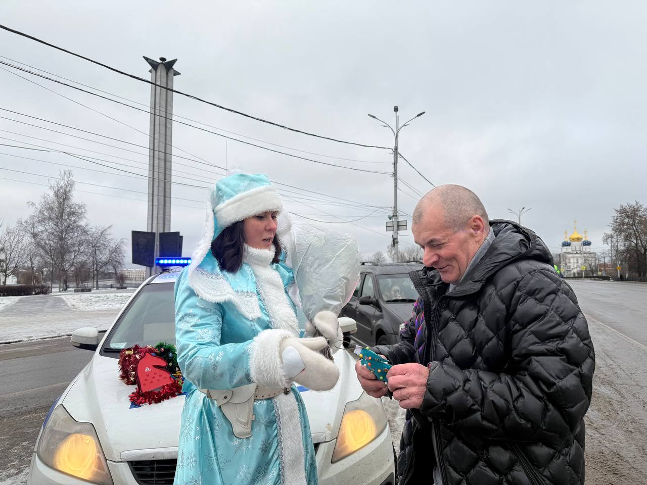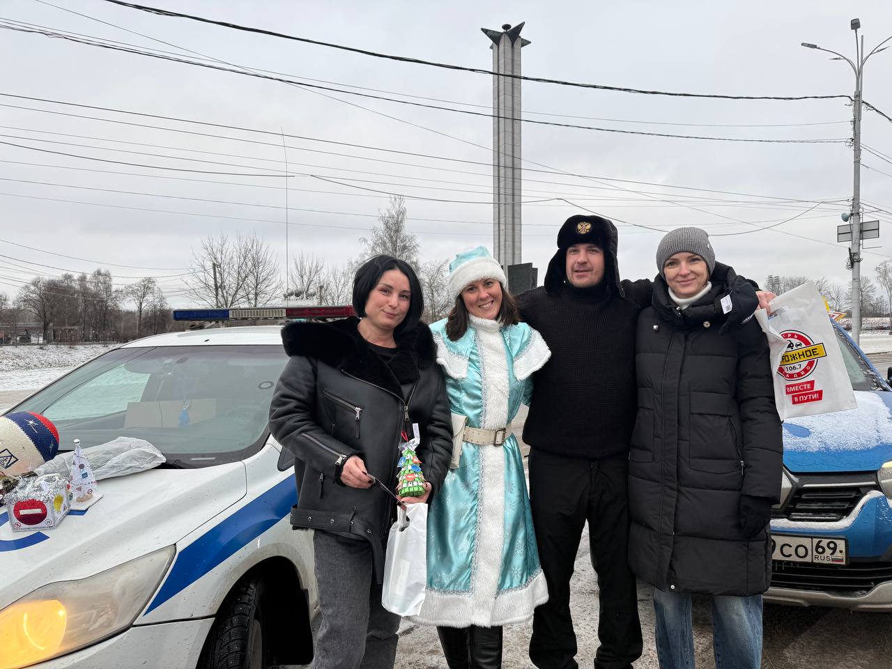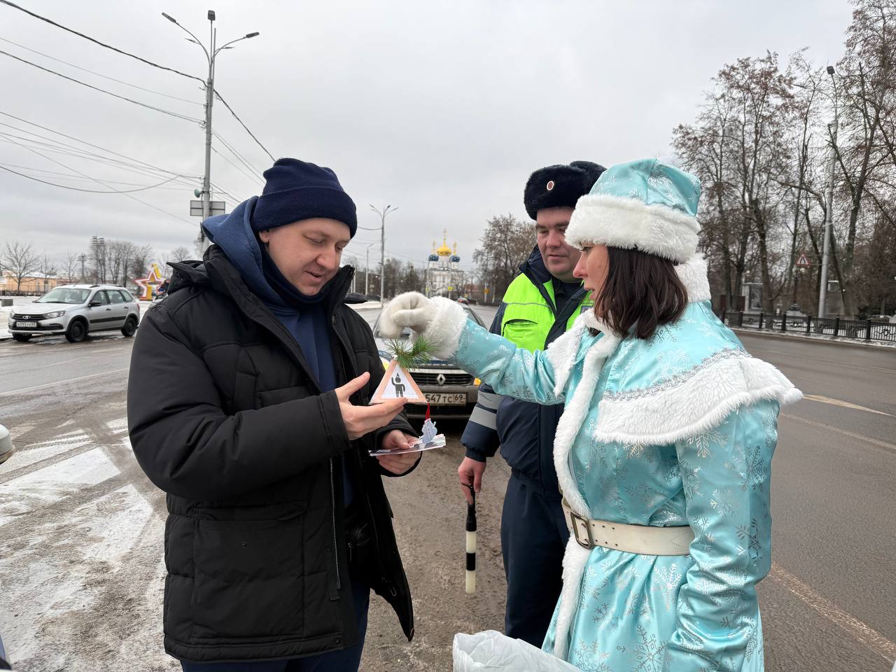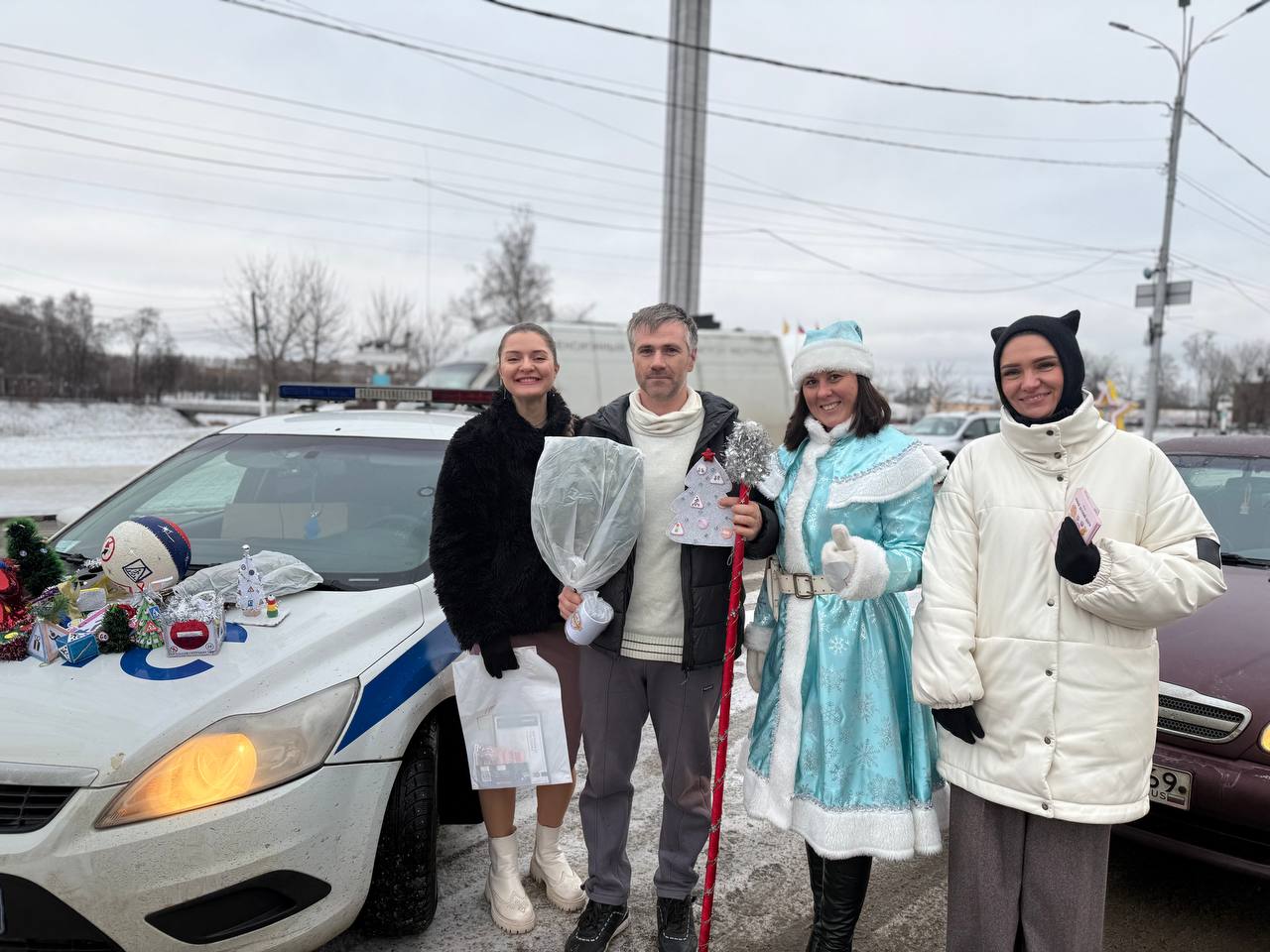 Автоинспектор и Полицейская Снегурочка совместно с командой Дорожного радио -Тверь на улицах нашего города поздравили водителей с наступающим Новым 2026 годом