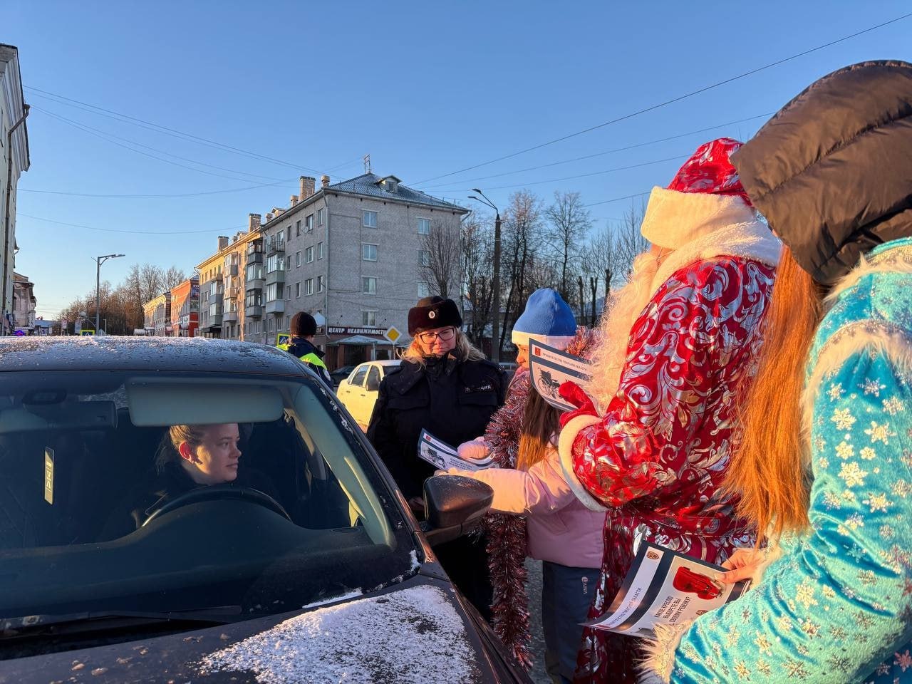 В Бологом Полицейский Дед Мороз напомнил водителям о важности детских удерживающих устройств