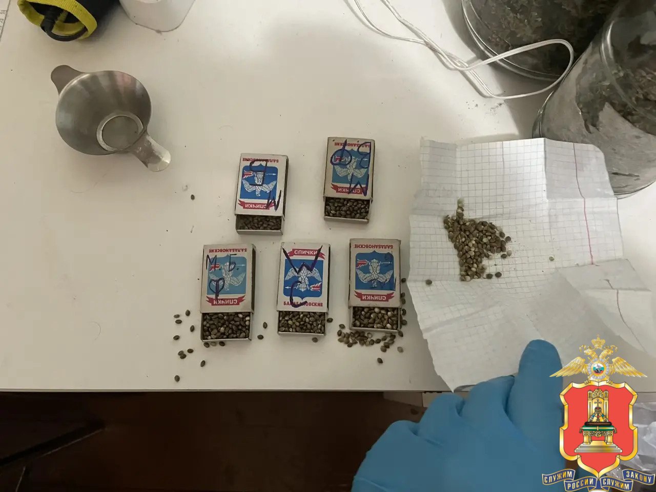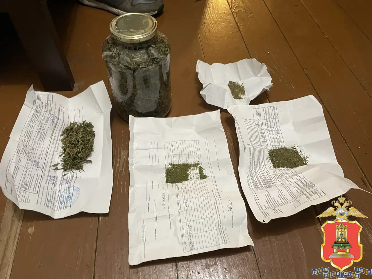 При обследовании помещения в подвале дома были обнаружены и изъяты 7 стеклянных банок,4 бумажных конверта и спичечные коробки с фрагментами растений зелёного цвета.