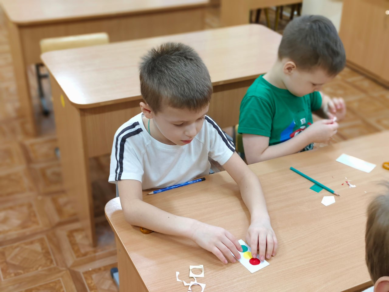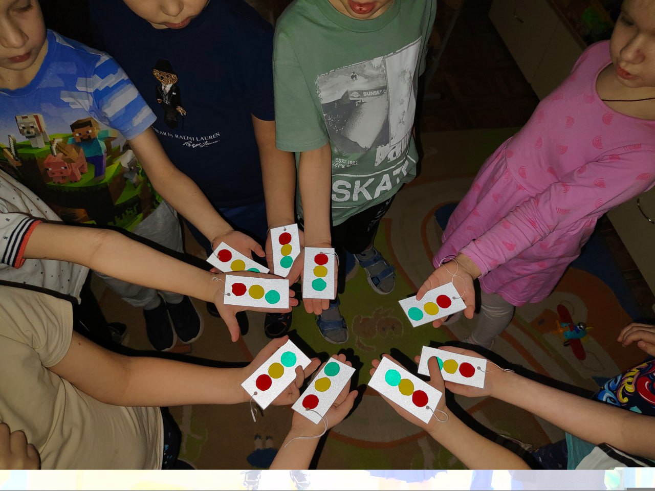 Дошколята с энтузиазмом вырезали кружки нужных цветов и аккуратно приклеивали их на специальную световозвращающую основу. Каждый получившийся брелок стал уникальным помощником в обеспечении видимости.