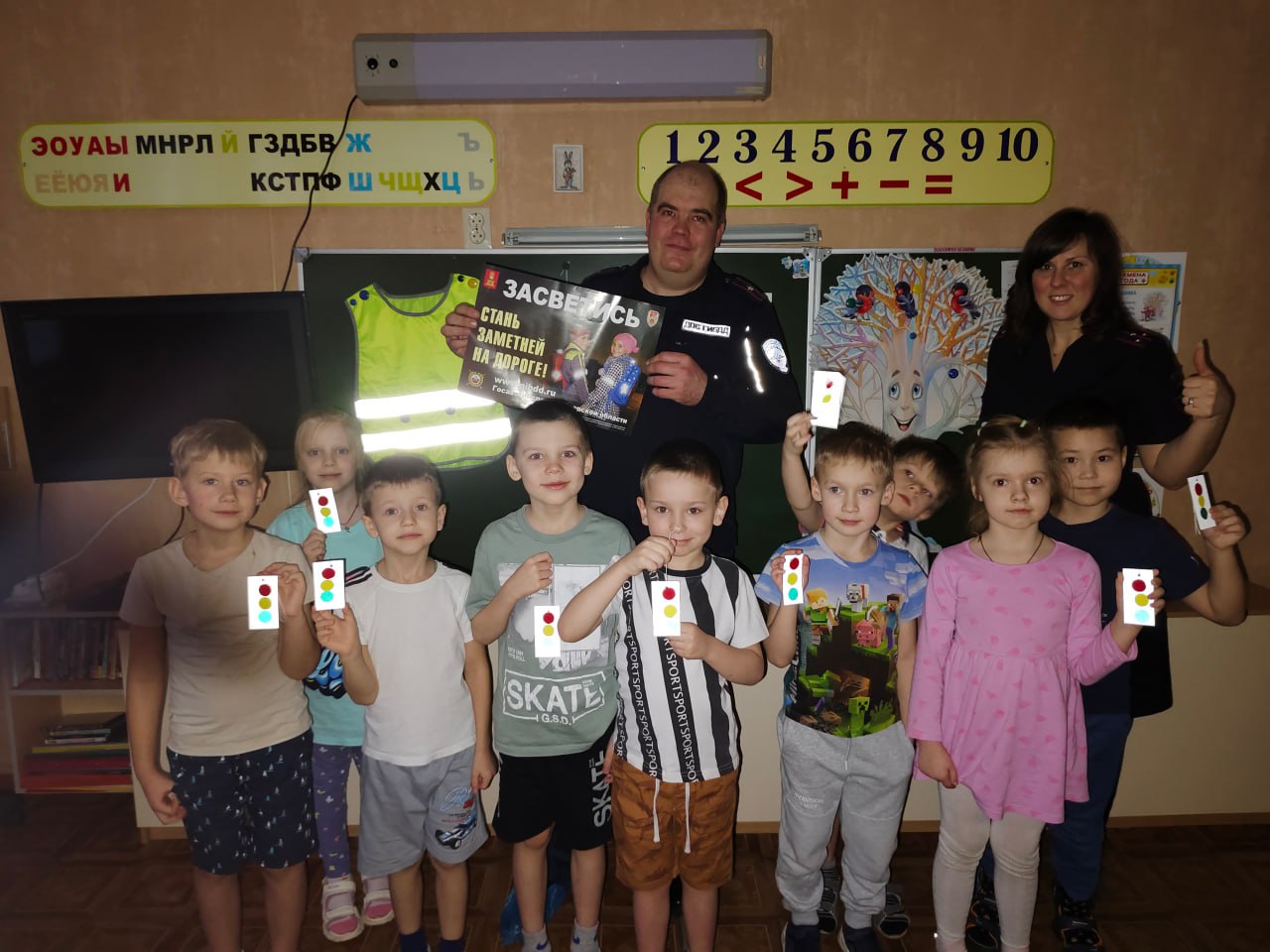 Кульминацией стало самое волшебное: инспекторы сделали общую фотографию со вспышкой, и все светофорчики ярко ЗАГОРЕЛИСЬ, показав свою чудодейственную силу! Восторг детей был неподдельным!