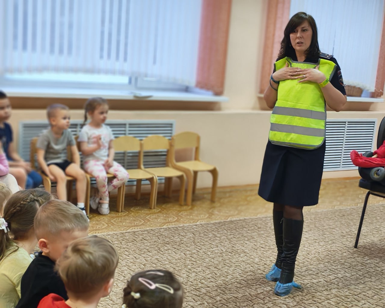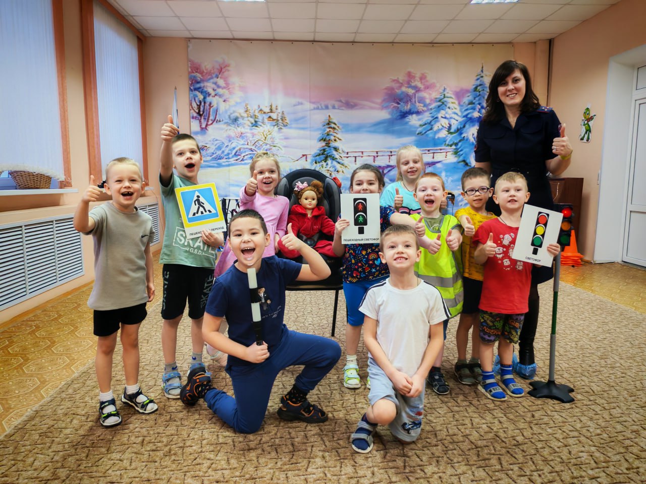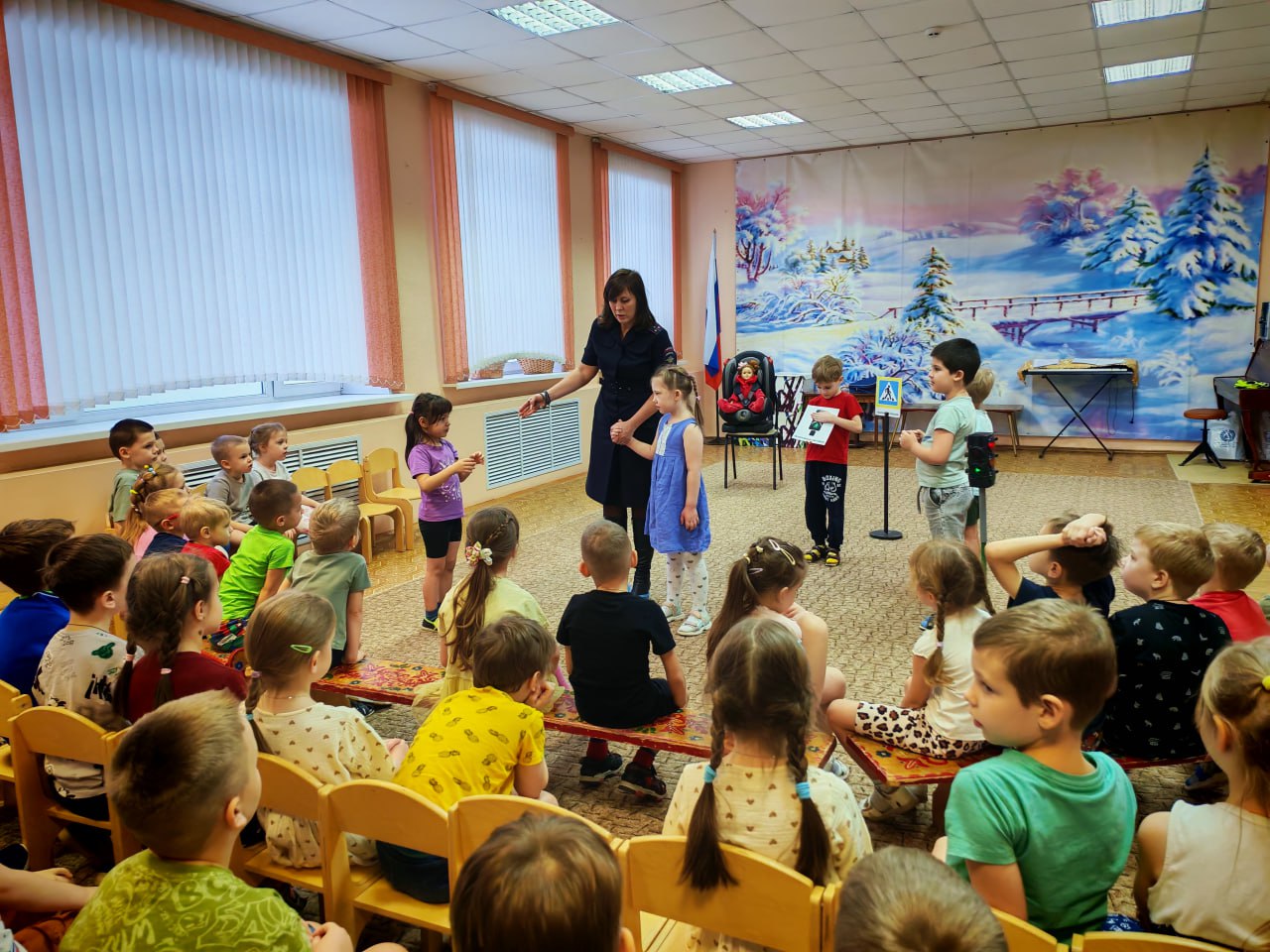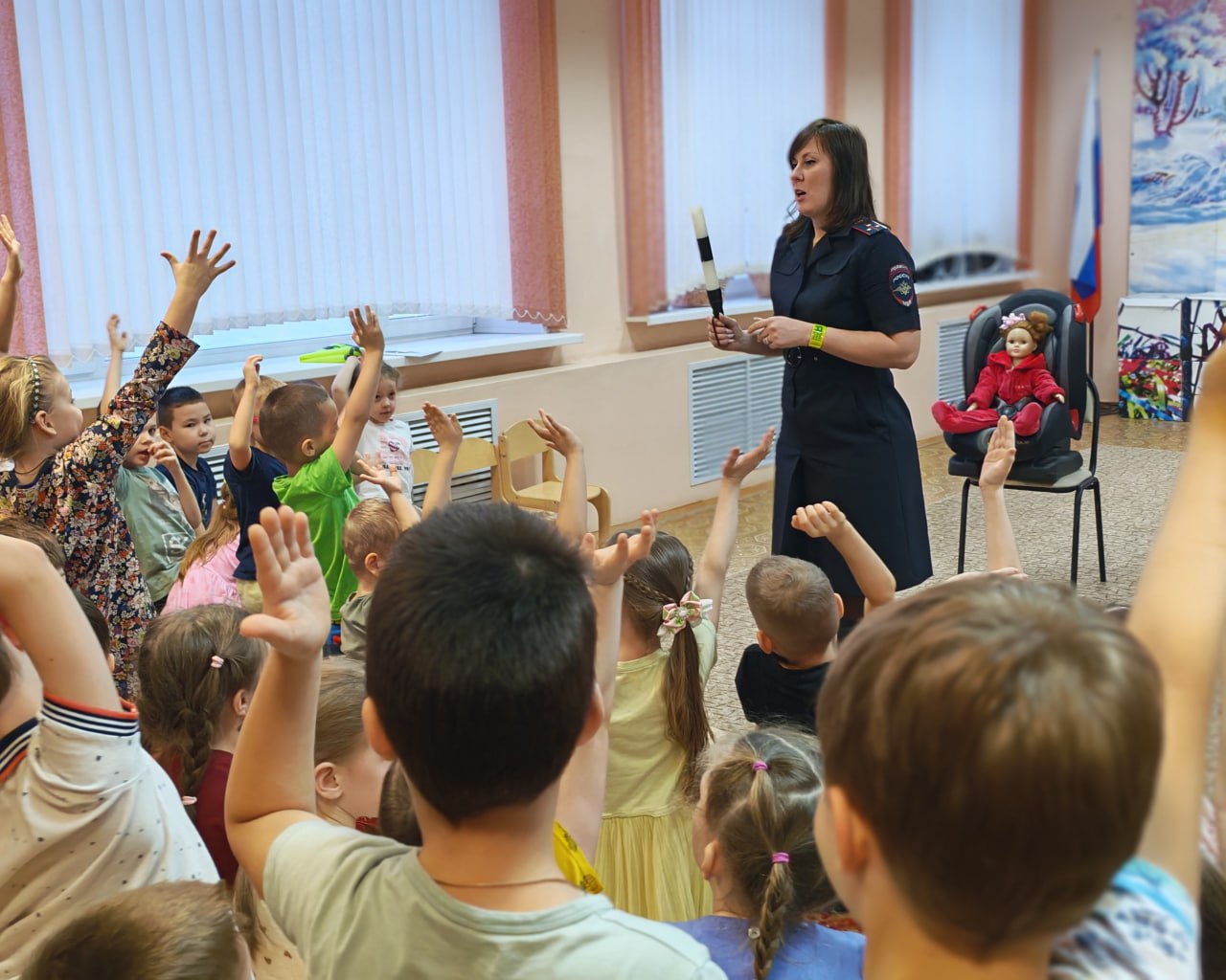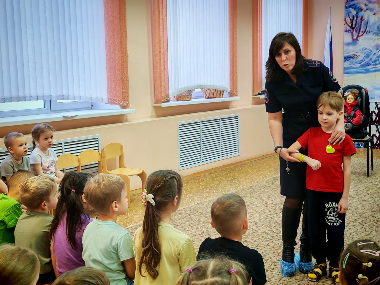 С помощью детского автокресла и куклы полицейские наглядно показали малышам, что происходит с пассажиром во время резкой остановки, если он не пристегнут. Ребята сами убедились: ремень безопасности и кресло — это не прихоть, а надежная защита!