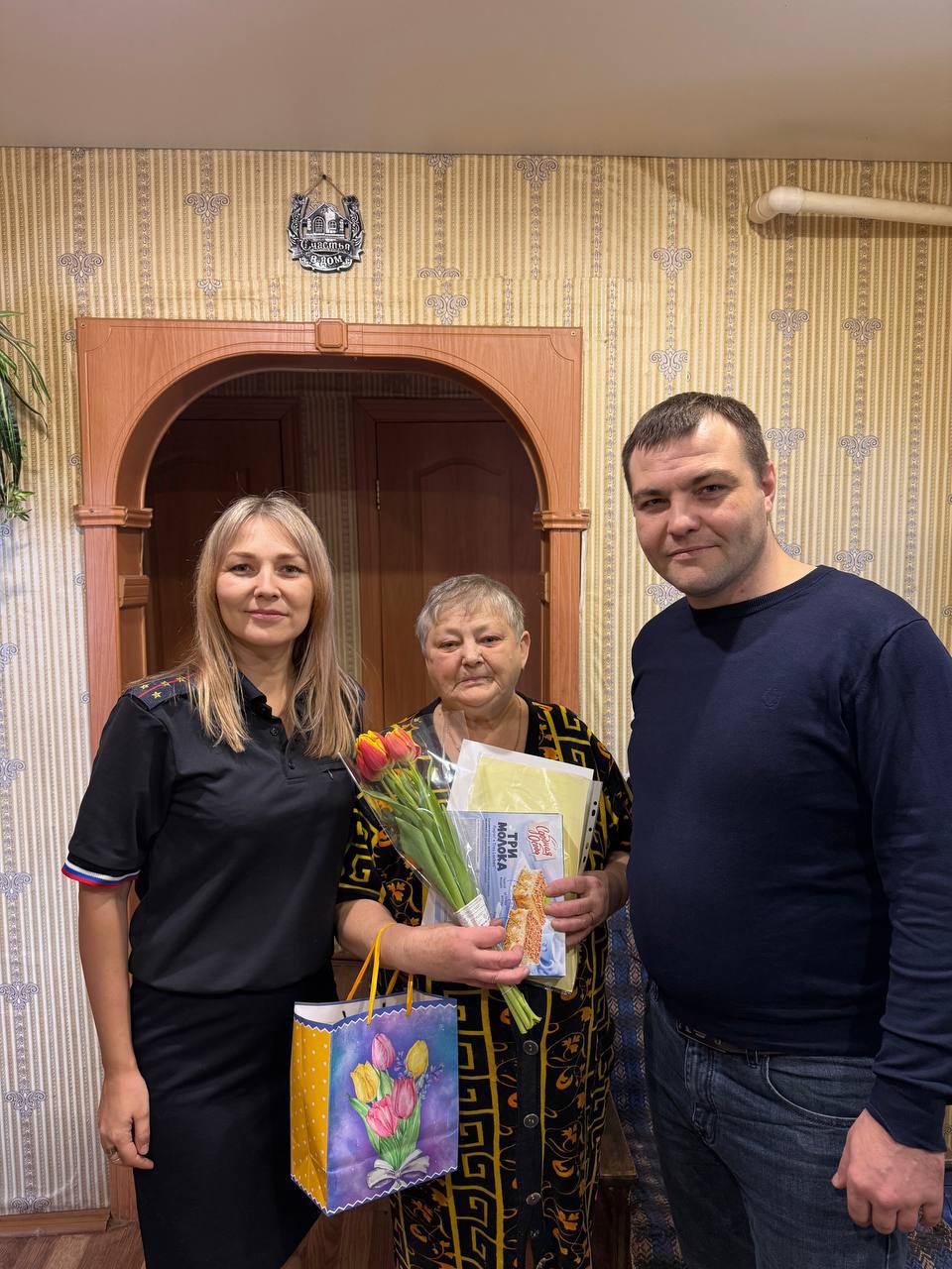 Сотрудник подразделения по работе с личным составом старший специалист капитан полиции Марина Полухина и начальник уголовного розыска ОМВД России «Калининский» майор полиции Сергей Улиткин поздравили Веру Николаевну с наступающим праздником, вручили цветы и подарок.