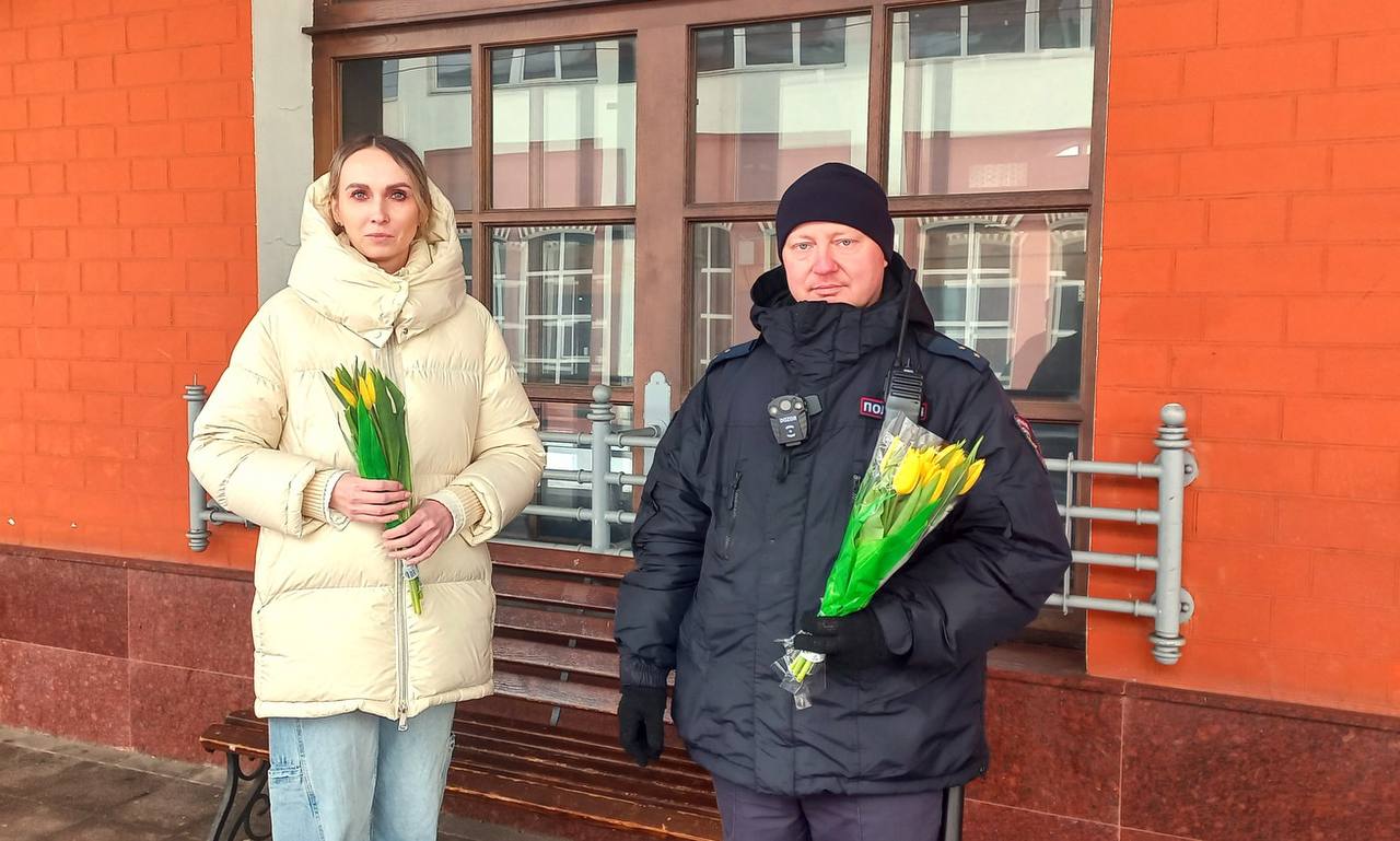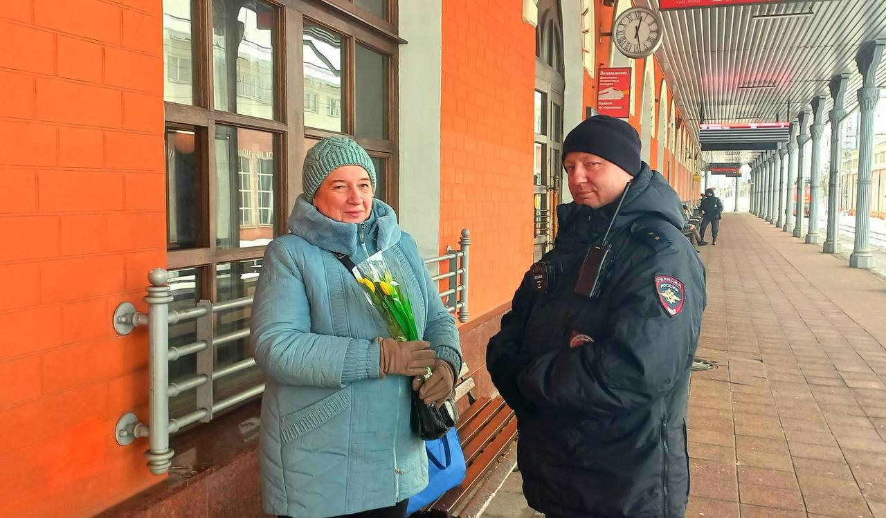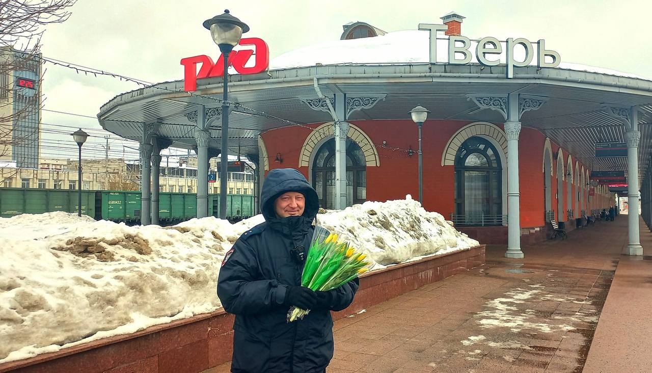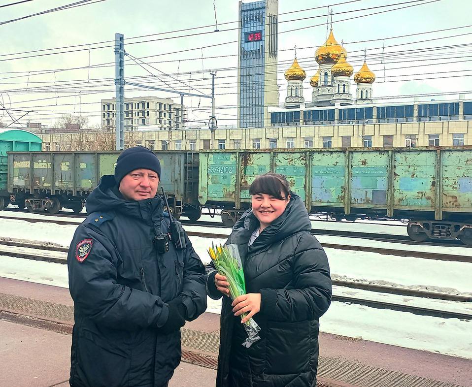 На железнодорожных вокзалах станций Тверь и Вышний Волочек транспортные полицейские и общественники поздравили женщин и девушек с наступающим Международным женским днем