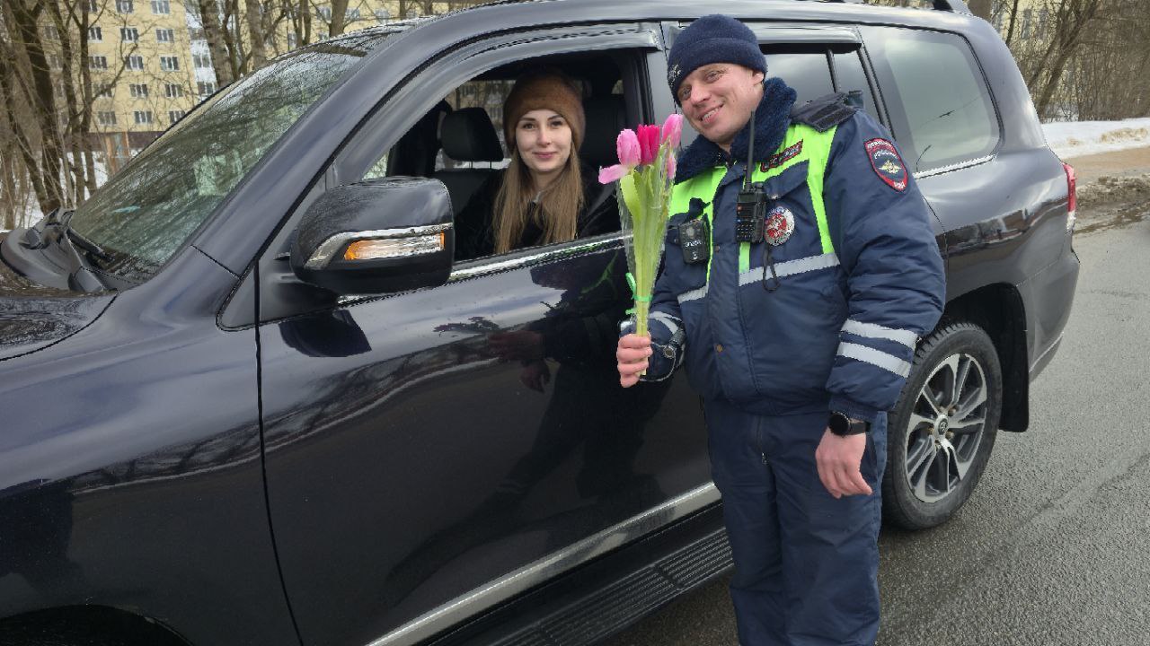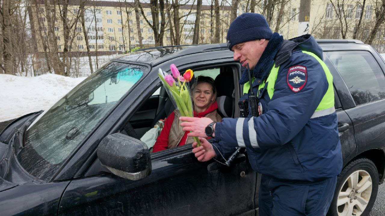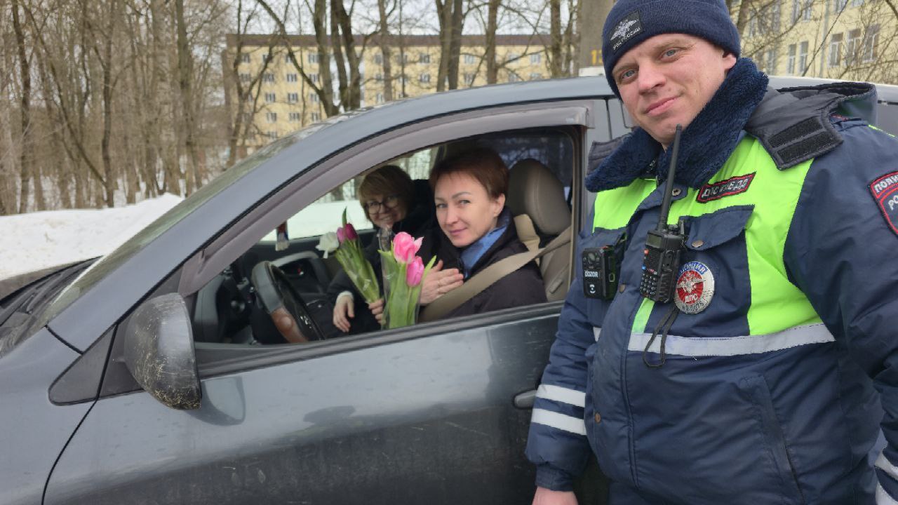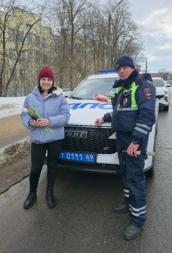 В преддверии Международного женского дня тверские автоинспекторы сменили привычный строгий регламент проверки документов на праздничное поздравление