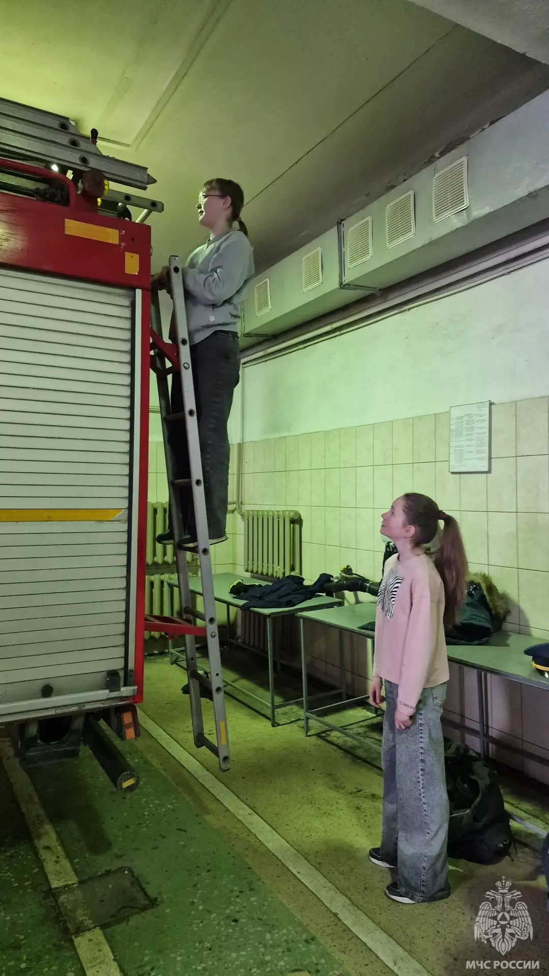 Огнеборцы показали ребятам пожарный автомобиль, аварийно-спасательный инструмент, обмундирование, средства спасения и защиты органов дыхания и зрения, а также гараж, пункт связи , учебный класс, комнату приёма пищи, базу ГДЗС.