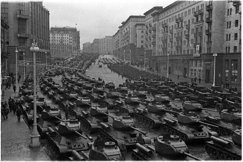 Москва. Военная техника на улице Горького (сейчас — улицы Тверская и 1-я Тверская-Ямская) перед Парадом Победы, 1945 год.