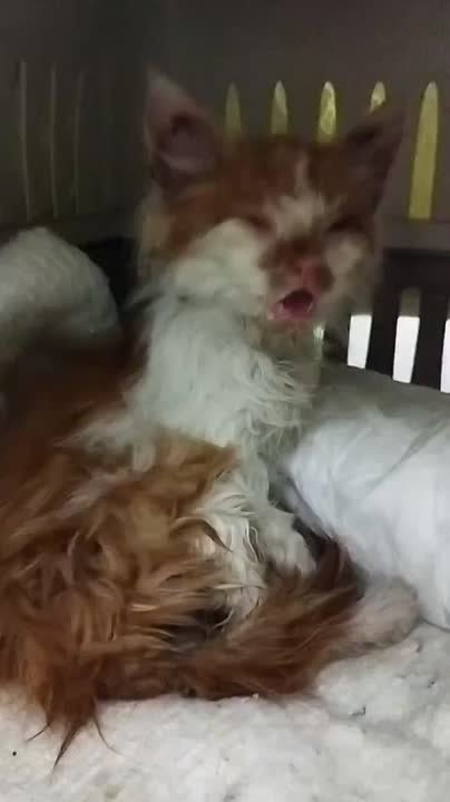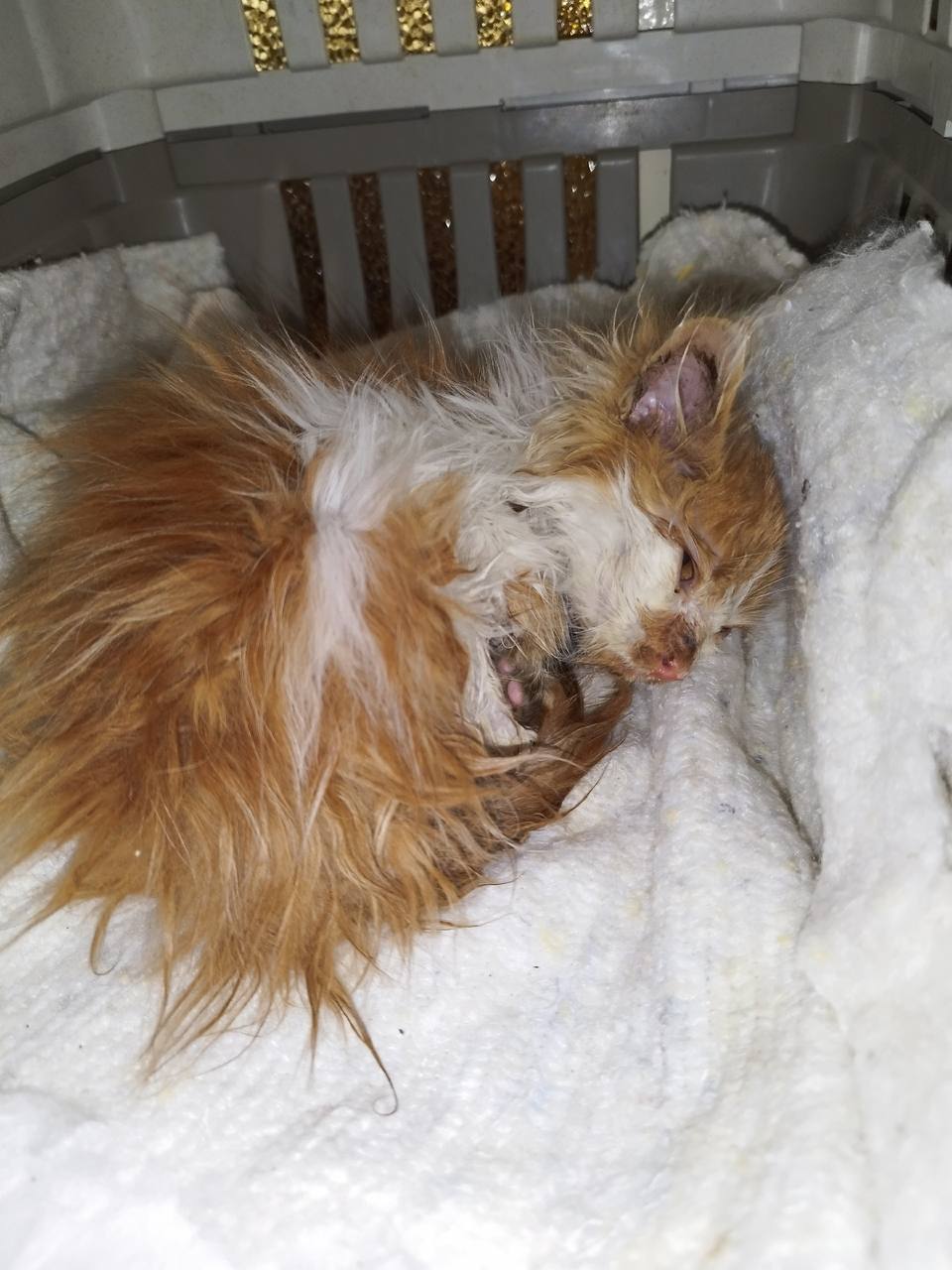 Димасика высушили феном, он уснул в переноске на теплой грелке. У котенка нос забит соплями, глаза воспалены, а потому волонтеры начали курс антибиотиков.