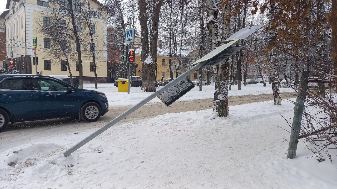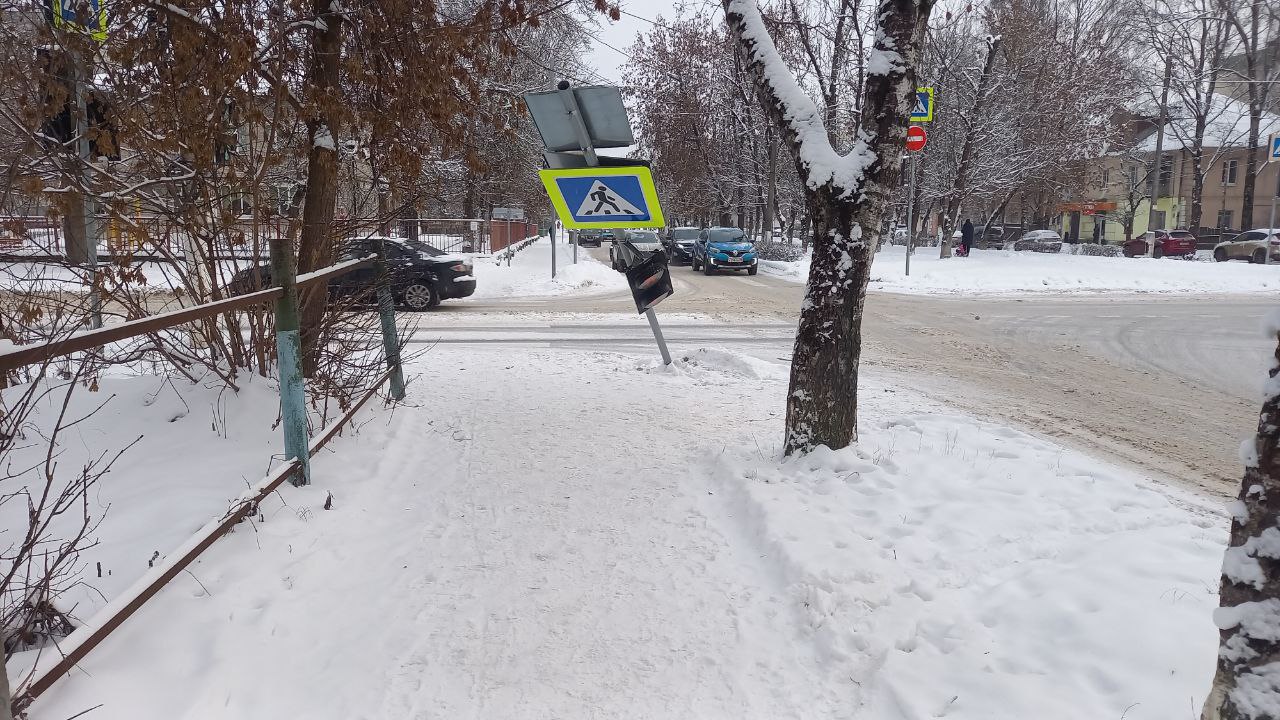 Светофор на пересечении бульвара Шмидта и улицы Мусоргского почти упал, но пытается работать. Примерно так выглядит рабочий день 30 декабря