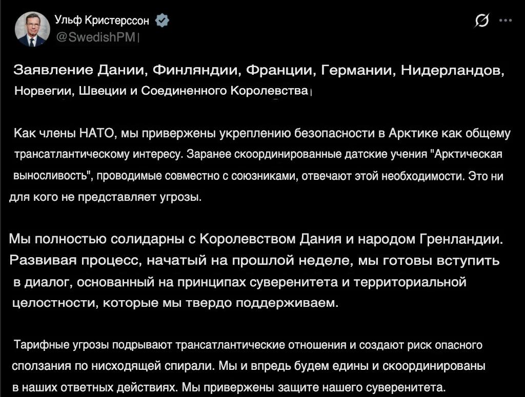«Как члены НАТО, мы привержены укреплению безопасности в Арктике в качестве общего трансатлантического интереса. Предварительно согласованные учения Дании, программа «Арктическая выносливость», проводимая совместно с союзниками, отвечает этой необходимости. Она ни для кого не представляет угрозы. Мы полностью солидарны с Королевством Дания и народом Гренландии. Развивая процесс, начатый на прошлой неделе, мы готовы вступить в диалог, основанный на принципах суверенитета и территориальной целостности, за которую мы твердо выступаем. Тарифные угрозы подрывают трансатлантические отношения и создают риск их опасного ухудшения. Мы продолжим действовать едиными и скоординированными методами. Мы привержены защите нашего суверенитета».