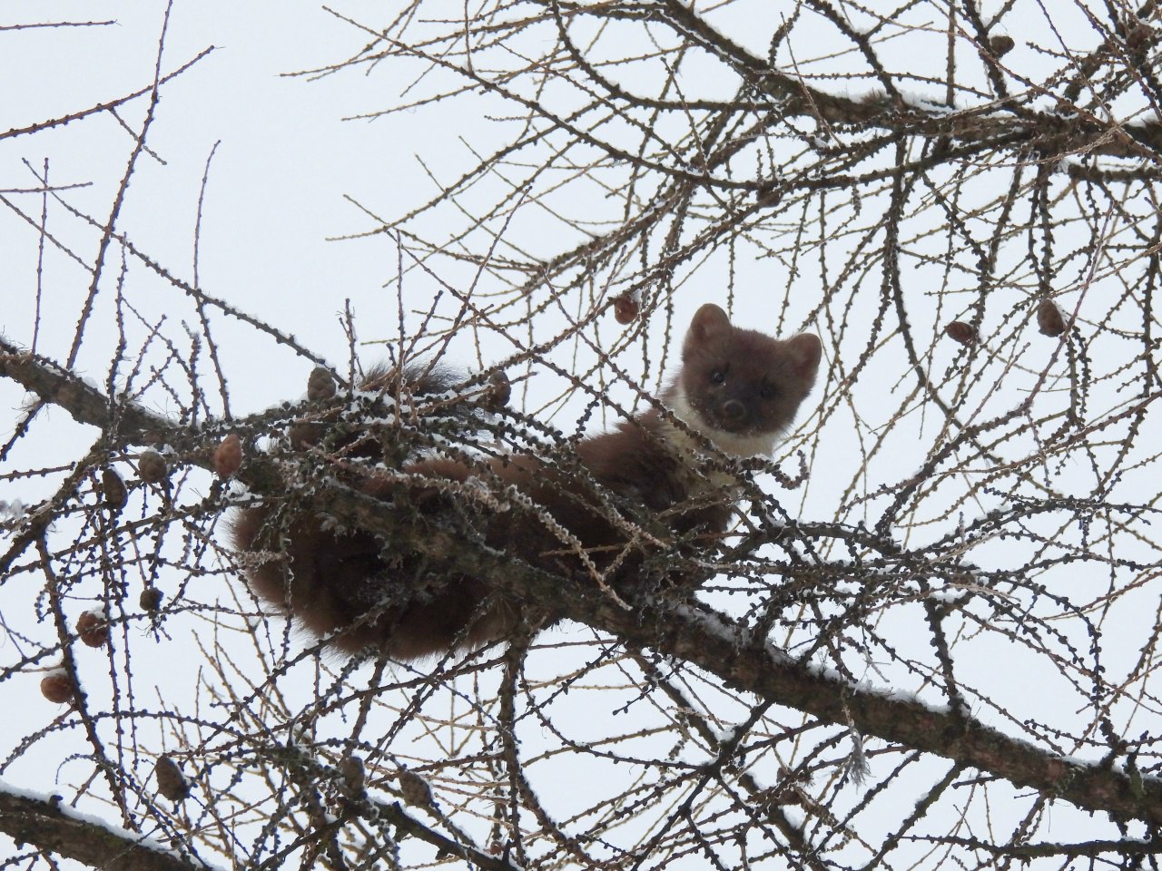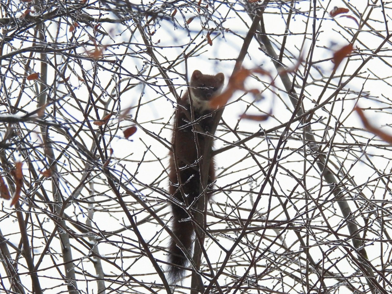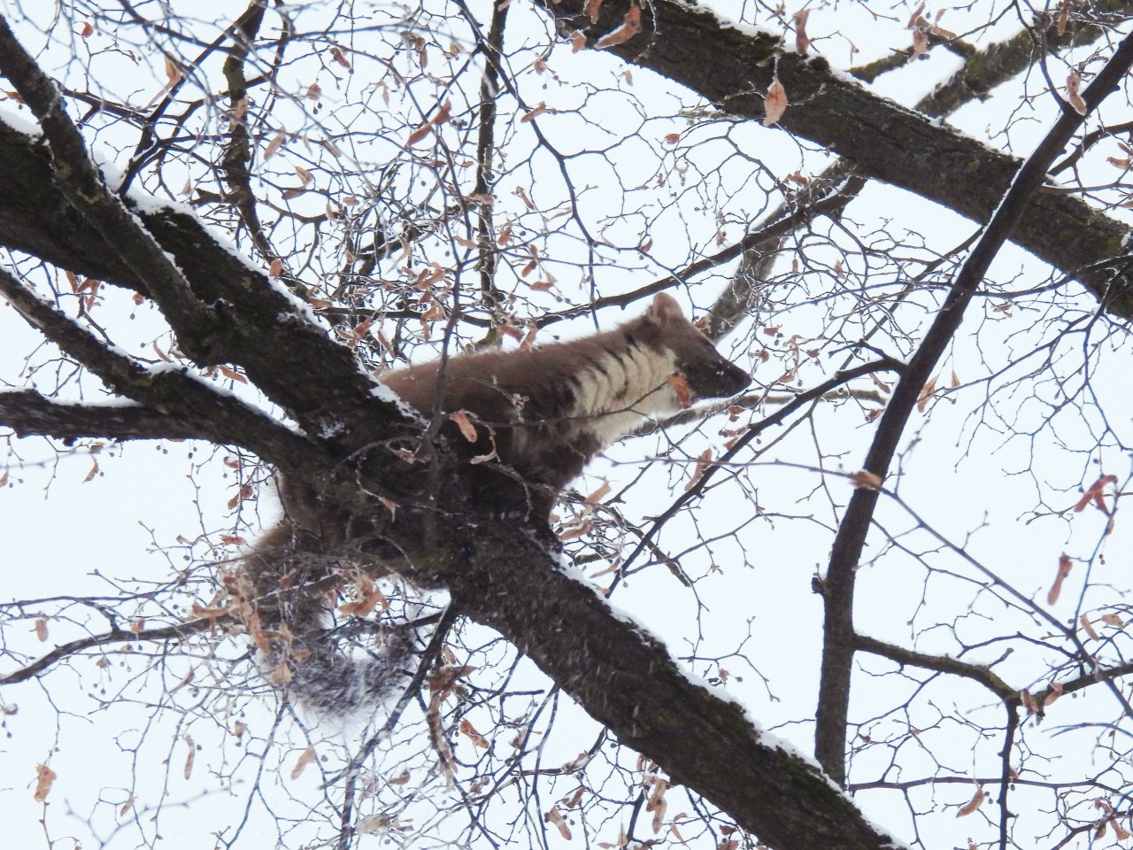 Сотрудники Тверской областной картинной галереи рассказали, что сегодня их снежный сад посетила пушистая гостья - лесная куница. Зверек грациозно скользил по ветвям высоких деревьев, восхищая посетителей своей ловкостью и изяществом.