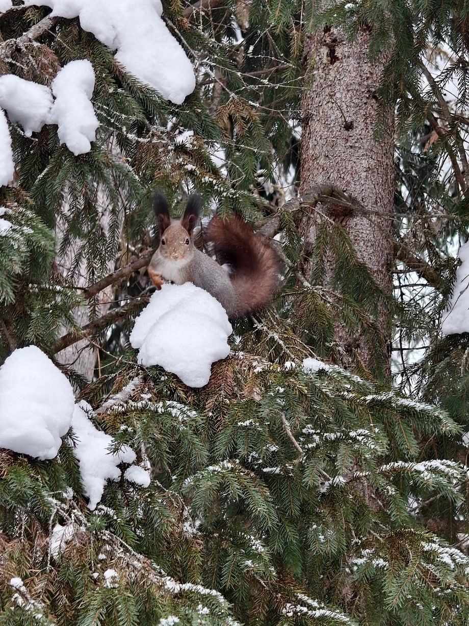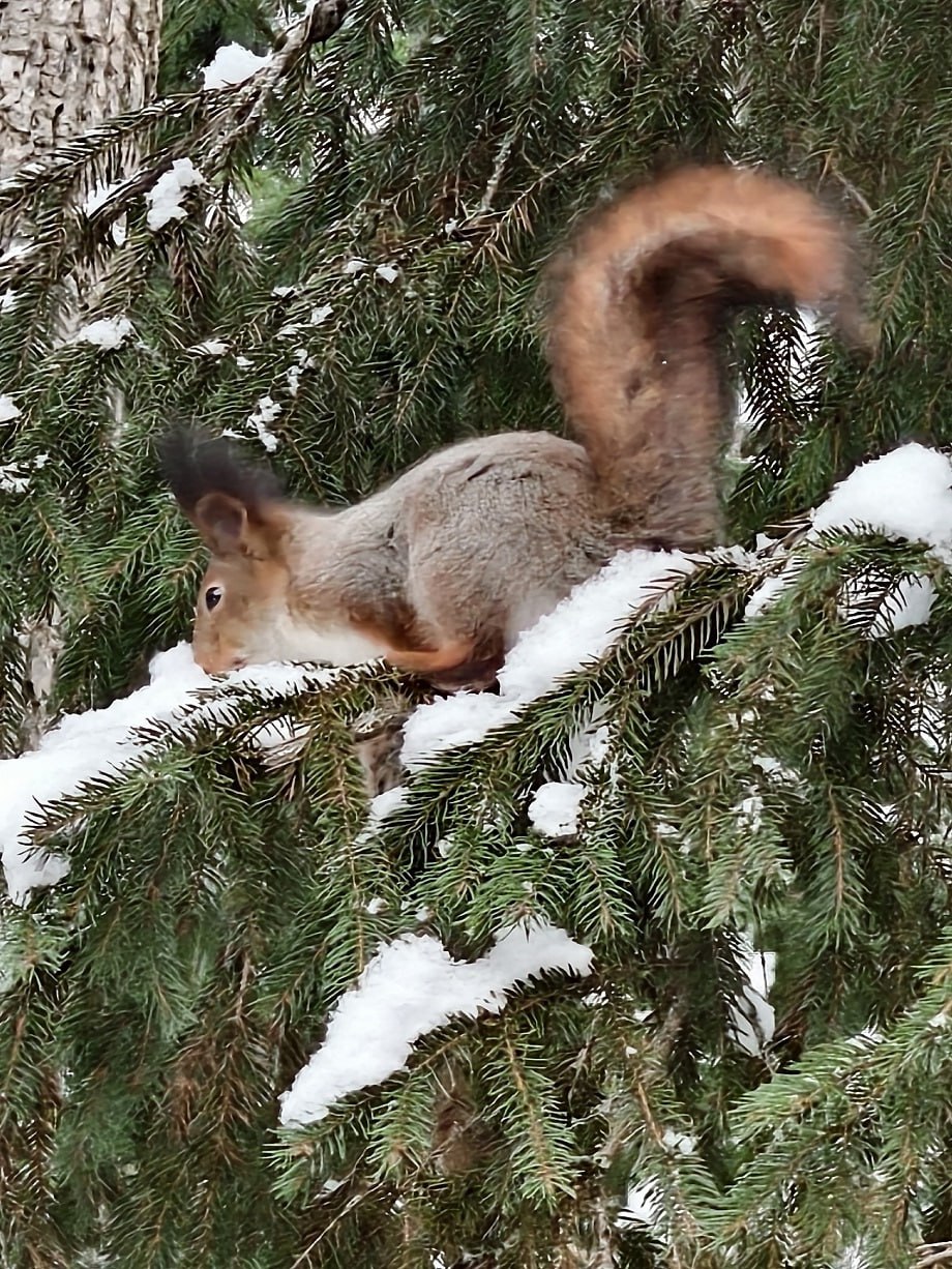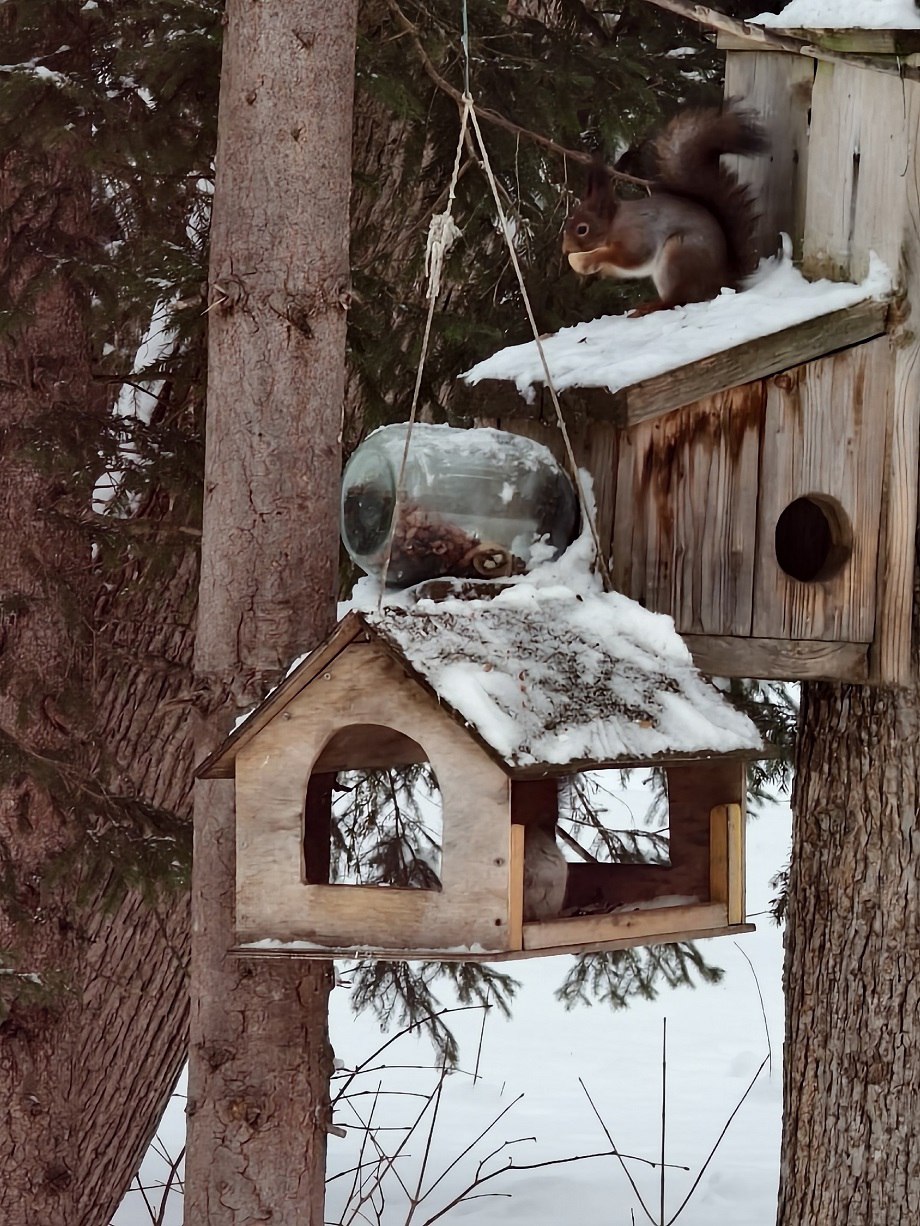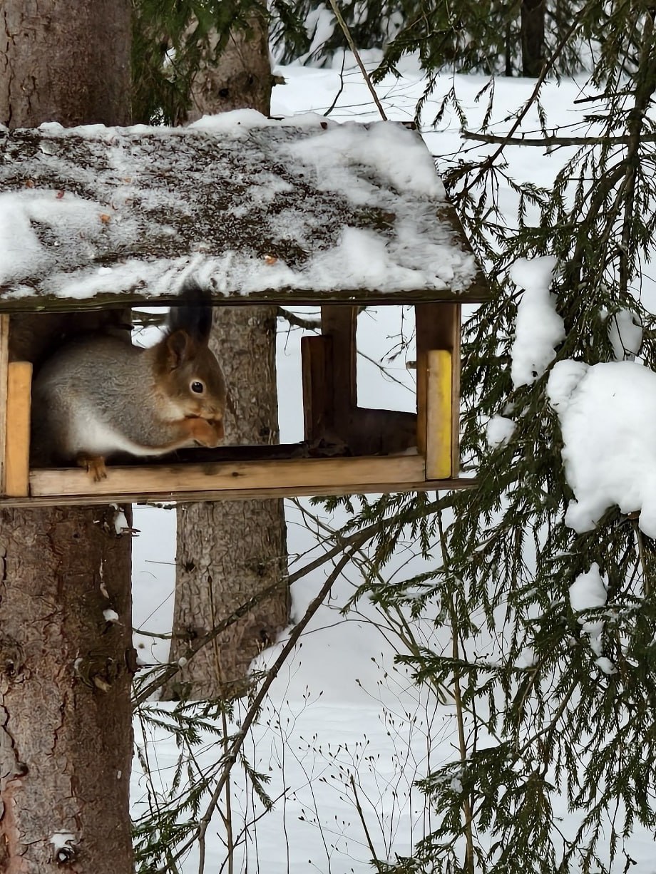 Но вместе с ней в кормушку заглянула и другая красавица – пушистая и очень красивая белка. Гостья тоже полакомилась угощениями птичьей столовой и стала объектом фотосессии.