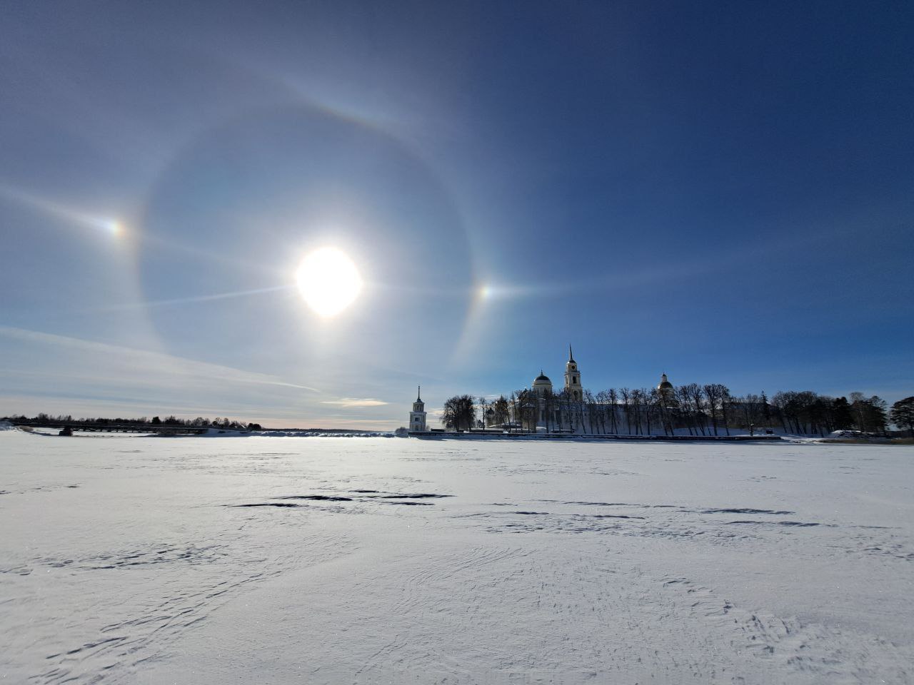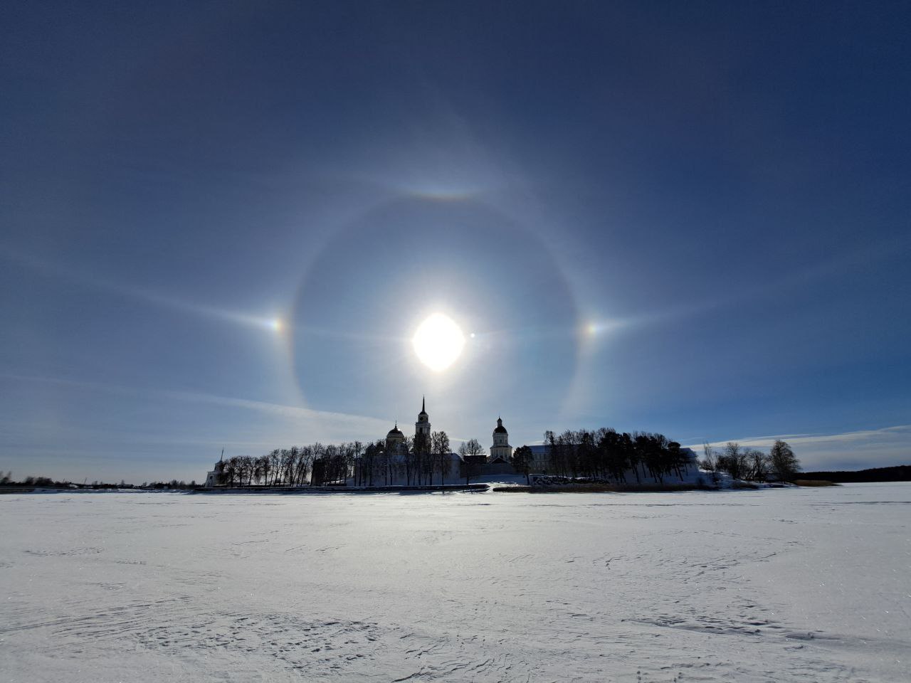 В Осташковском округе Тверской области, в небе над монастырем Нило-Столобенская пустынь сегодня, 23 февраля, появилось невероятно-красивое солнечное гало. Фотографии яркого атмосферного явления опубликованы в канале монастыря в Телеграм.