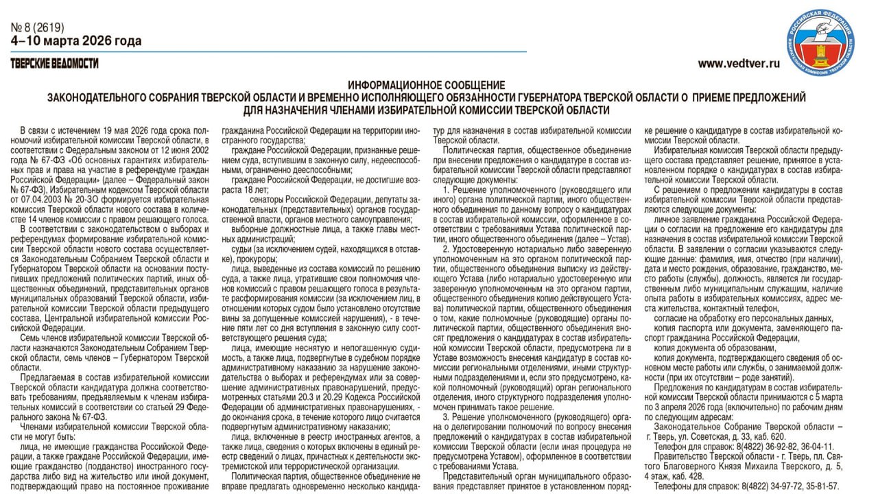 Сегодня в газете «Тверские ведомости» (№8 от 4-10 марта 2026 года) официально опубликовано информационное сообщение Законодательного Собрания Тверской области и врио Губернатора Тверской области о приеме предложений для назначения членами избирательной комиссии Тверской области.