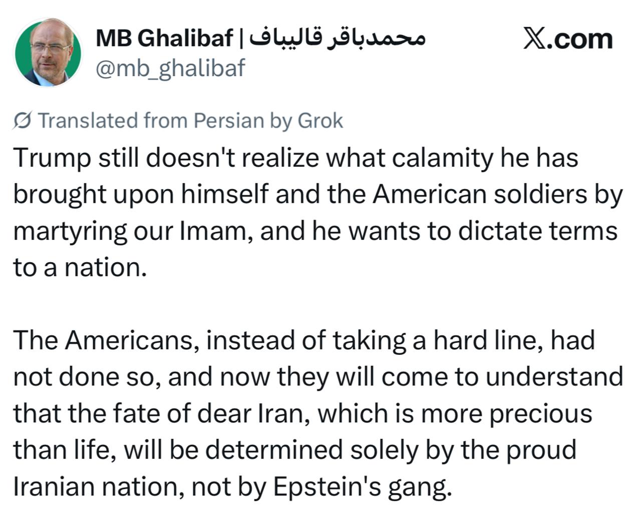 Спикер парламента Ирана Галибаф – о том, что судьбу Ирана «банда Эпштейна» не решит: