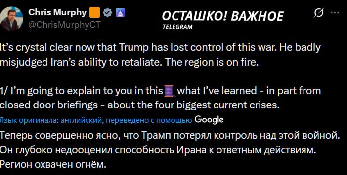 Уже ясно, что Трамп не только ввязался в войну без ясного плана действий и тем более без стратегии выхода из войны, а потому утрата контроля над военным конфликтом, о котором говорит сенатор Мерфи, была лишь вопросом времени. В США это ощущается, но основные телеканалы типа CNN твердят, что Америке придется испытать "short pain for a long gain" - "краткую боль за долгий выигрыш", и непрерывно бомбардируют американцев пропагандой, доказывающей, что США побеждают и скоро все завершится. Серьезные военные эксперты считают иначе. Есть также информация, что глава Комитета начальников штабов, генерал Кейн пытался отговорить Трампа от операции, но не преуспел.