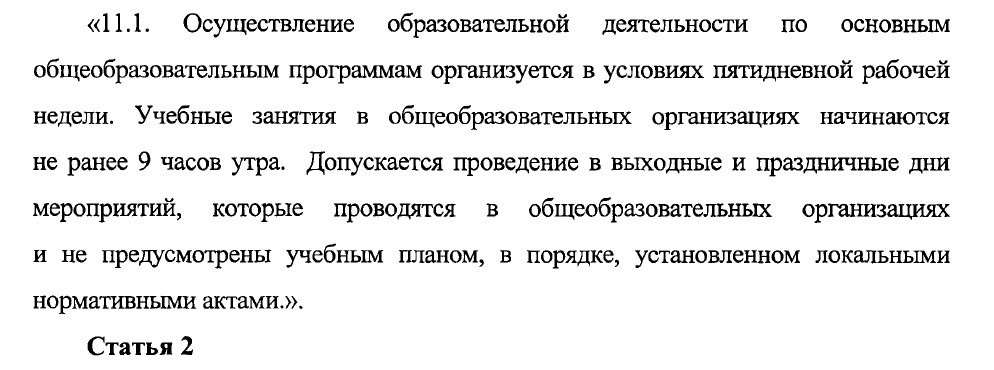 «Осуществление образовательной деятельности по основным образовательным программам организуется в условиях пятидневной рабочей недели. Учебные занятия в общеобразовательных организациях начинаются не ранее 9 часов утра. Допускается проведение в выходные и праздничные дни мероприятий, которые не предусмотрены учебным планом», - сказано в документе.