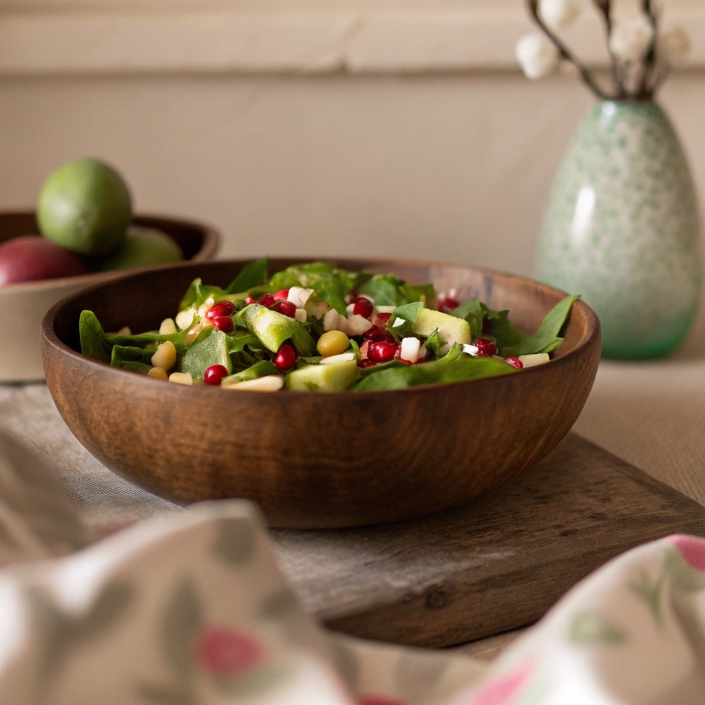 Этот салат удивляет не только своей красотой, но и питательностью. Сочетание свежих зеленых листьев, сладких гранатовых зерен и хрустящих орешков делает его настоящим украшением стола. Он не только порадит глаз, но и зарядит организм полезными микроэлементами: