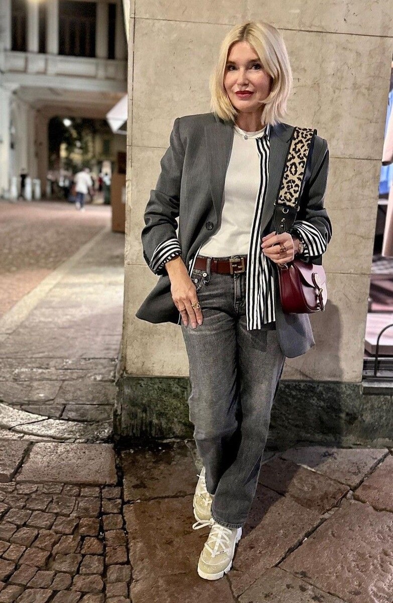Светло-серые джинсы: Простые прямые джинсы идеально сочетаются с белой футболкой и черно-белой полосатой рубашкой. Лаконичный серо-стальной жакет и бежевые кроссовки завершат повседневный look.Укороченные джинсы с бахромой: Создайте контрастный casual-образ, сочетая светло-синие джинсы с элегантной блузкой и оригинальным кардиганом. Завершите набор светло-коричневыми кедами для гармонии.Домашний уют: Зауженные укороченные джинсы в тандеме с белой футболкой и зеленым пальто – это простой, но эффектный комплект, который можно дополнить леопардовыми туфлями на каблуках.Оригинальный ансамбль: Темно-синие джинсы с накладными карманами в сочетании с нежной бежевой блузкой и удлиненным трикотажным пальто создают стильный образ, полный текстур и цветов.Элегантная простота: Укороченные широкие белые джинсы в паре со строгой белой рубашкой и кардиганом добавят элегантности в осенний look. Бежевые кроссовки подчеркнут утонченный стиль.Многослойность: Прямые серые джинсы, бледно-голубая рубашка и светло-серый джемпер с воротником-поло дополняются леопардовым платком для выразительности.Монохромный стиль: Темно-коричневые брюки и трикотажная водолазка вишневого цвета создают стильный образ, завершенный бордовыми ботинками для трендового акцента.Спорт-стиль: Ярко-голубой спортивный костюм можно дополнить бежевым пальто и фиолетовым шарфом, чтобы добавить модные яркие акценты.Сдержанная элегантность: Светло-синие укороченные джинсы в комплексе со светло-серым свитером и жемчужным пальто создадут стильный образ с яркими лоферами.Кэжуал эффект: Темно-серые брюки и леопардовая блузка в сочетании с светло-серым палантином обеспечивают комфорт и стиль, идеально подходя для осени.Эти свежие идеи нарядов помогут женщинам всех возрастов выбрать стиль для любой ситуации и подчеркнуть свою красоту в любой день осени.