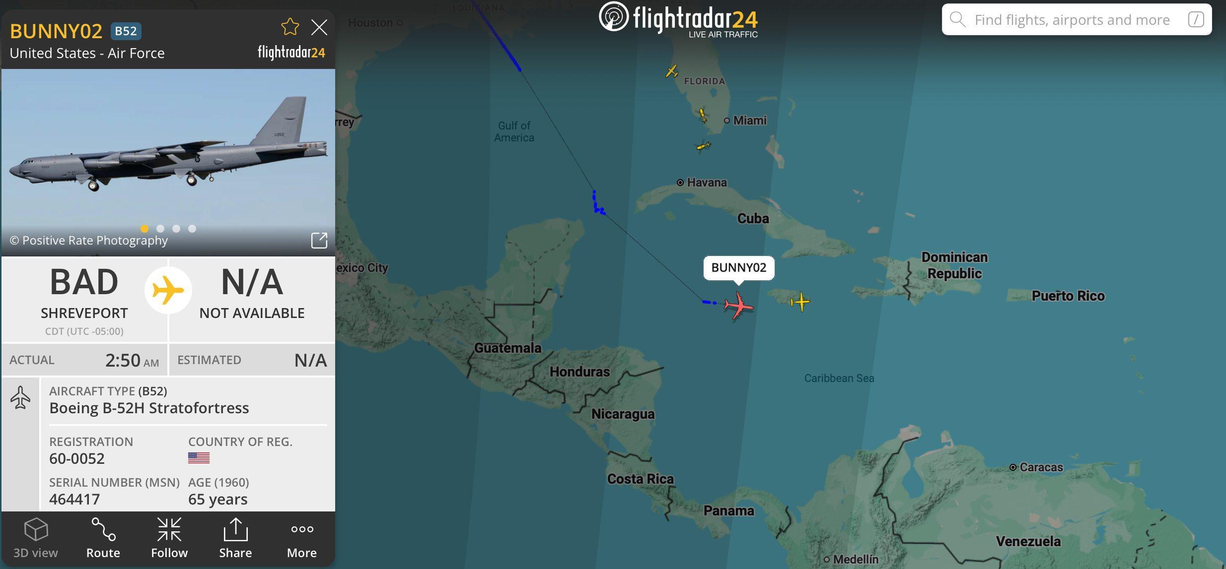 А вот и еще один элемент давления США на Венесуэлу. Три стратегических бомбардировщика B-52H ВВС США в настоящее время пролетают над Карибским морем. Сейчас они отмечаются у Гаити в восточном направлении.