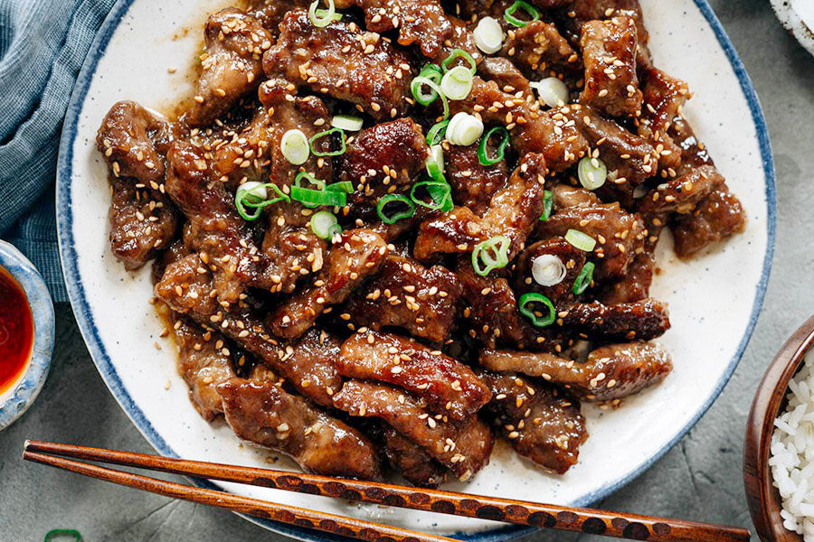 Начинать нужно с подготовки говядины: нарезать мясо на тонкие ломтики (толщиной около 3-4 мм), нарезая поперек волокон. Это обеспечит нежность готового блюда.В глубокой миске смешать мякоть с шаосинским вином, черным перцем и солью. После этого добавить кукурузный крахмал и тщательно перемешать. Оставить мариноваться на 15 минут.Теперь необходимо соединить все ингредиенты, необходимые для соуса, в отдельной миске, предварительно тщательно перемешав.В сковороде разогреть растительное масло на среднем огне. Выложить подготовленные кусочки говядины в один слой, обжаривать до золотистой корочки примерно 1-2 минуты с каждой стороны. Если сковорода маленькая – обжаривать в несколько этапов.После обжаривания, убрать мясо со сковороды, а в оставшееся масло влить соус, довести до кипения, помешивая до загустения.Вернуть мясо обратно в сковороду, тщательно перемешать, чтобы каждый кусочек равномерно покрылся соусом. Последний штрих – посыпка жареными семенами кунжута для неповторимого аромата и вкуса.