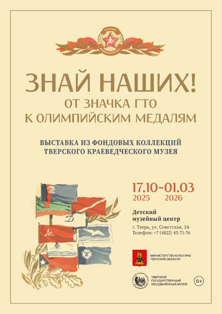 17 октября в Детском музейном центре в Твери начнёт работу выставка «Знай наших! От значка ГТО к олимпийским медалям» (6+), где будут представлены материалы о спортивных достижениях отечественных спортсменов.