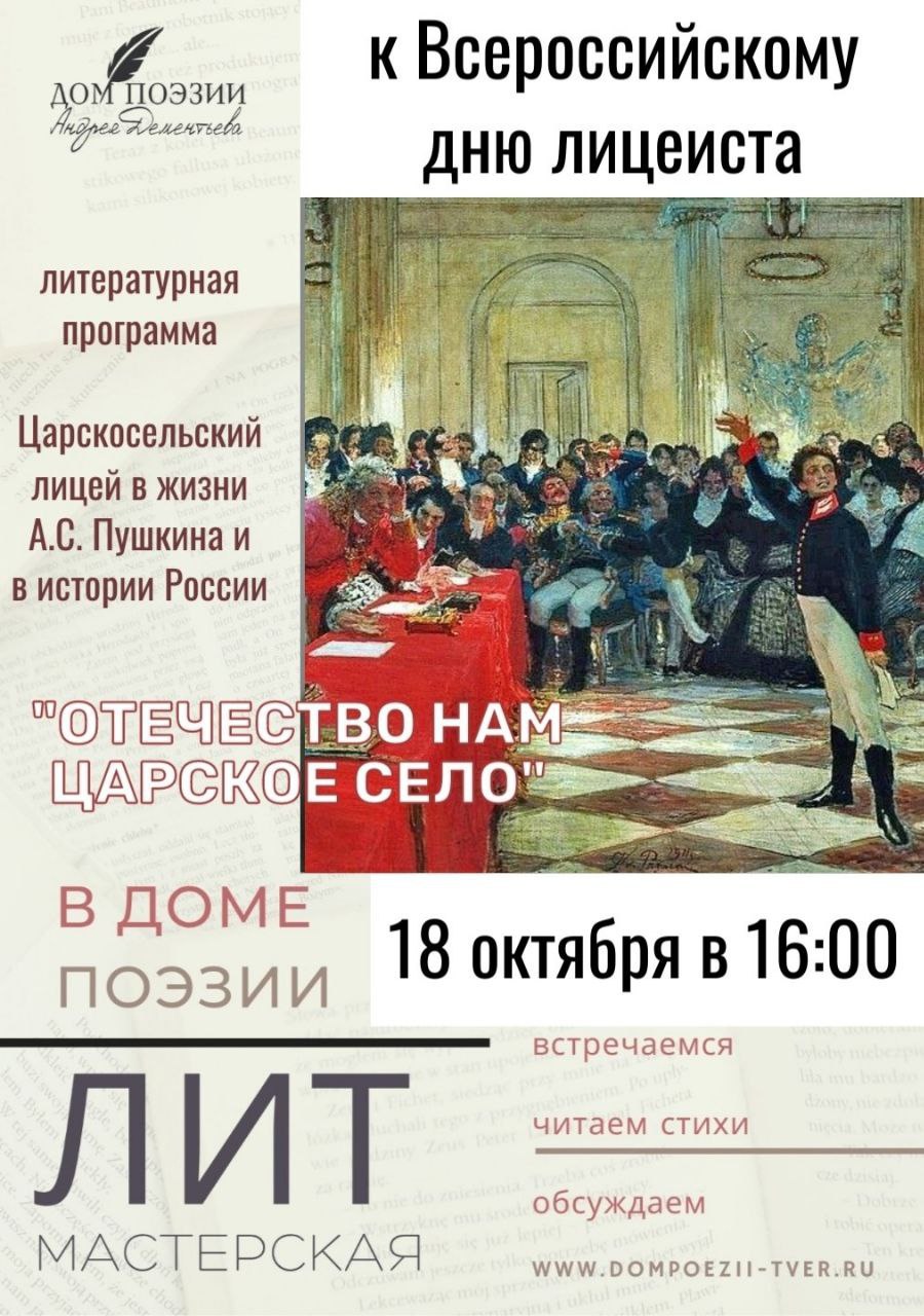 18 октября – Всероссийский день лицеиста. В Доме поэзии Андрея Дементьева в Твери в честь праздника будет организована литературная программа «Отечество нам Царское Село» (12+).