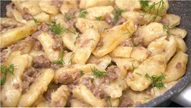 Готовые галушки откидываются на дуршлаг, после чего их смешиваем с готовым фаршем и обжариваем все вместе на сковороде буквально пару минут. И вот, сытное блюдо готово к подаче!