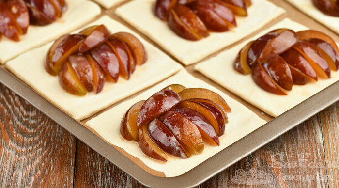 Слепите вкусные сладкие слойки, используя свежие сливы (11 шт.). Сливы очищаются от косточек и нарезаются на дольки. Добавьте крахмал (1 ст. л.) и сахарную пудру (2 ст. л.), перемешайте. Это поможет загустить сок, который выделится при выпекании. Затем сформируйте 8 заготовок из размороженного слоеного теста, уложите на них ломтики слив, смазав края взбитым яйцом. Выпекайте в заранее разогретой духовке при 180 градусах около 20 минут.