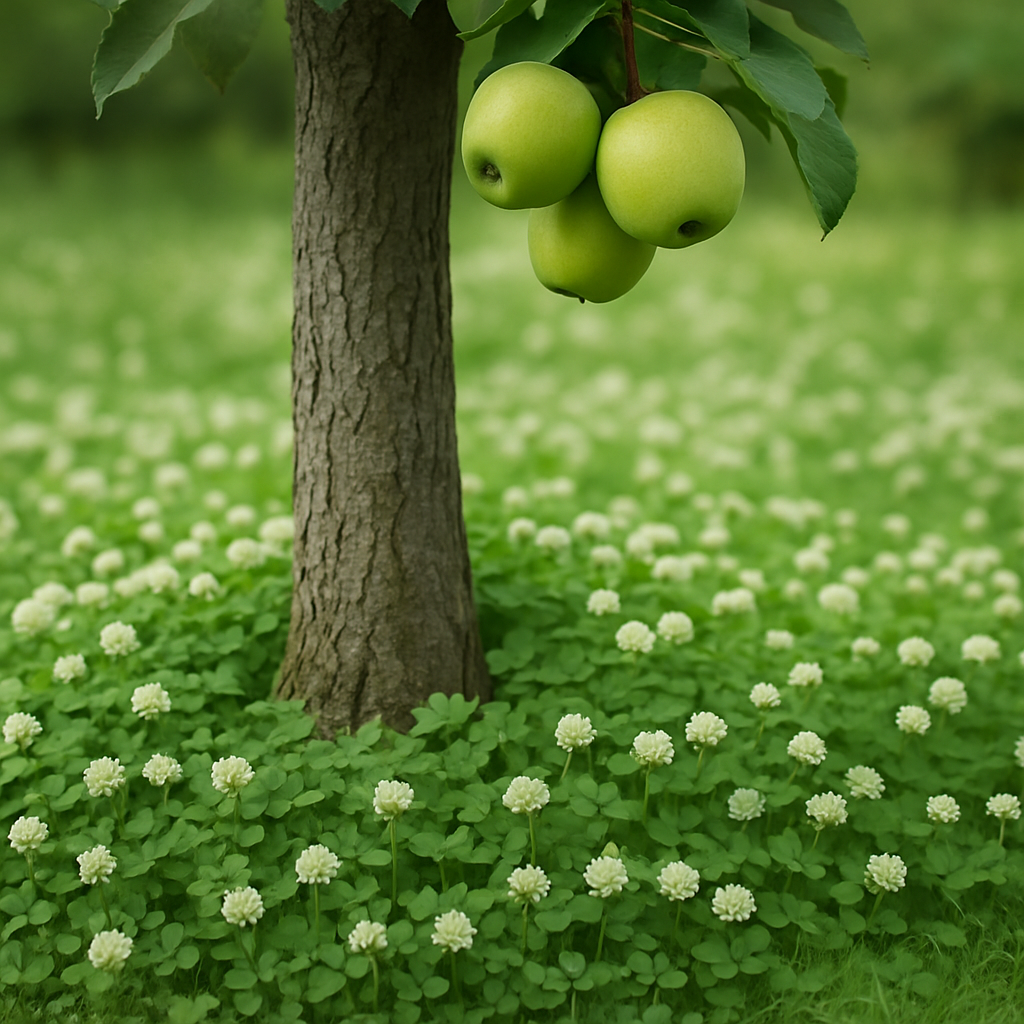 - Смесь 1: микроклевер + овсяница красная. Подходит для постоянного покрытия пространства под взрослыми яблонями. Норма — 4–5 г/м? микроклевера и 12–15 г/м? овсяницы. Микроклевер обеспечивает мягкий азот, а овсяница способствует образованию плотной дернины.