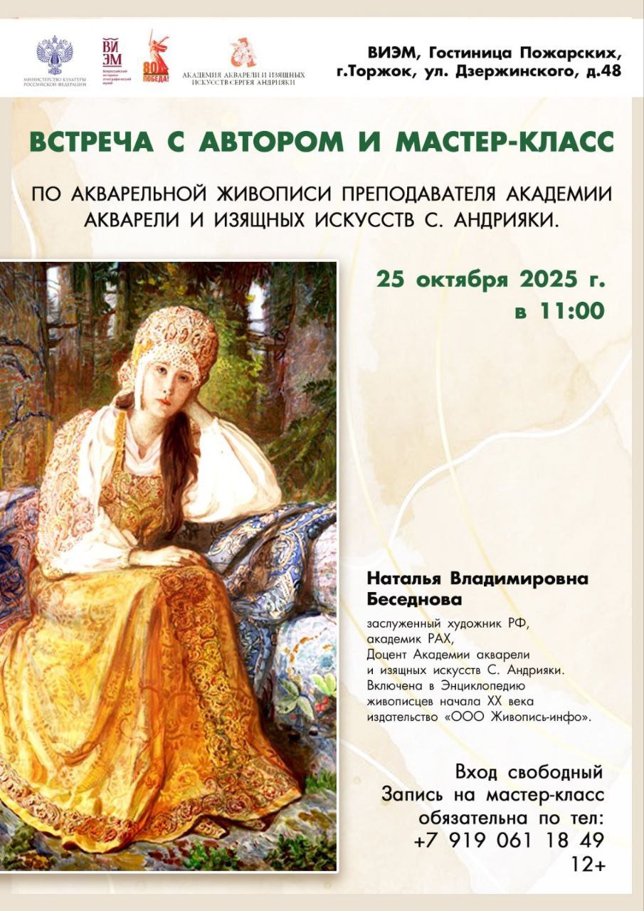 25 октября в Гостинице Пожарских в Торжке - мастер-класс по акварельной живописи (12+). Участие бесплатное, количество мест ограничено, запись по телефону: +7 919-061-18-49.