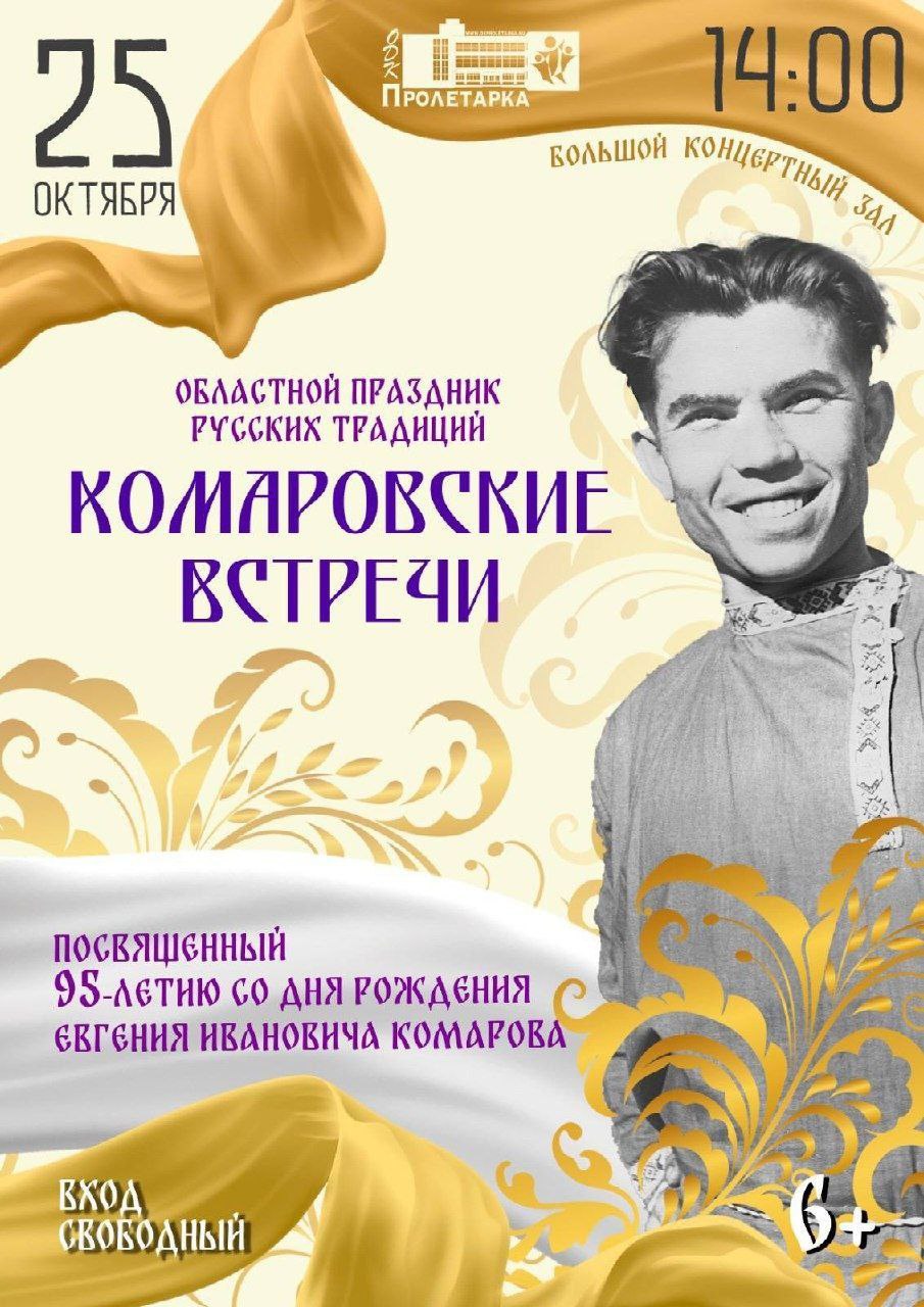 25 октября в ОДК «Пролетарка» – праздник народных традиций «Комаровские встречи» (6+), посвящённый 95-летию со дня рождения основателя народного ансамбля танца «Тверичане» Евгения Комарова.