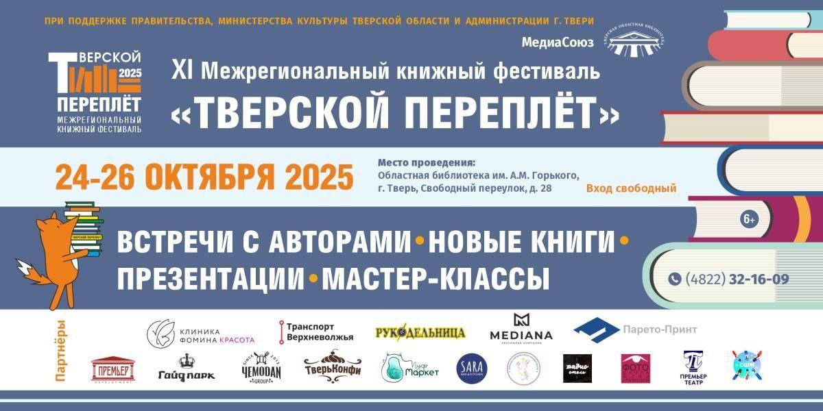 С 24 по 26 октября в Тверской областной библиотеке имени А.М. Горького будет проходить ХI Межрегиональный книжный фестиваль «Тверской переплёт» (6+): презентации книг, встречи с литераторами и учёными, мастер-классы, лекции.