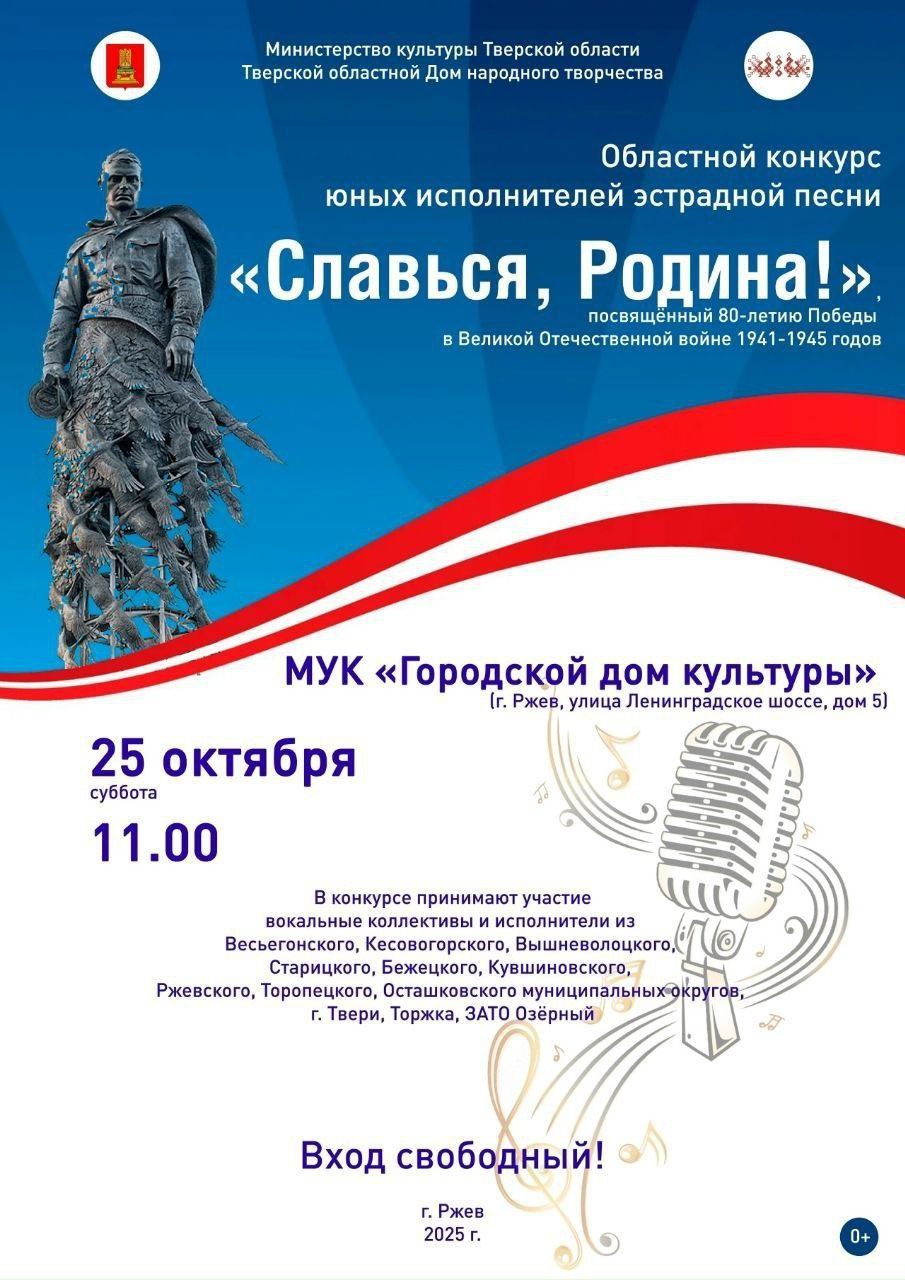 В Ржеве 25 октября пройдет финал областного конкурса юных исполнителей эстрадной песни «Славься, Родина!» (6+). Прозвучат патриотические песни в исполнении 50 вокальных коллективов и солистов из Твери и Торжка, Бежецкого, Весьегонского, Вышневолоцкого, Кесовогорского, Кувшиновского, Осташковского Ржевского, Старицкого, Торопецкого округов, ЗАТО Озёрный.