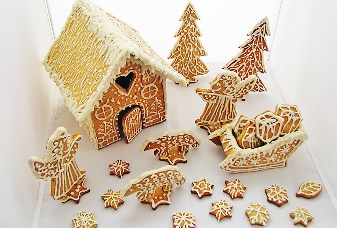 Глазурь готовится из белка яйца, смешанного с сахарной пудрой и лимонным соком. Желательно дать ей консистенцию густой сметаны для удобства использования. Наполните кондитерский мешок и начните украшение готовых деталей. Для надежного соединения используйте горячую карамель, приготовленную из сахара и воды, доведенной до золотистого цвета.