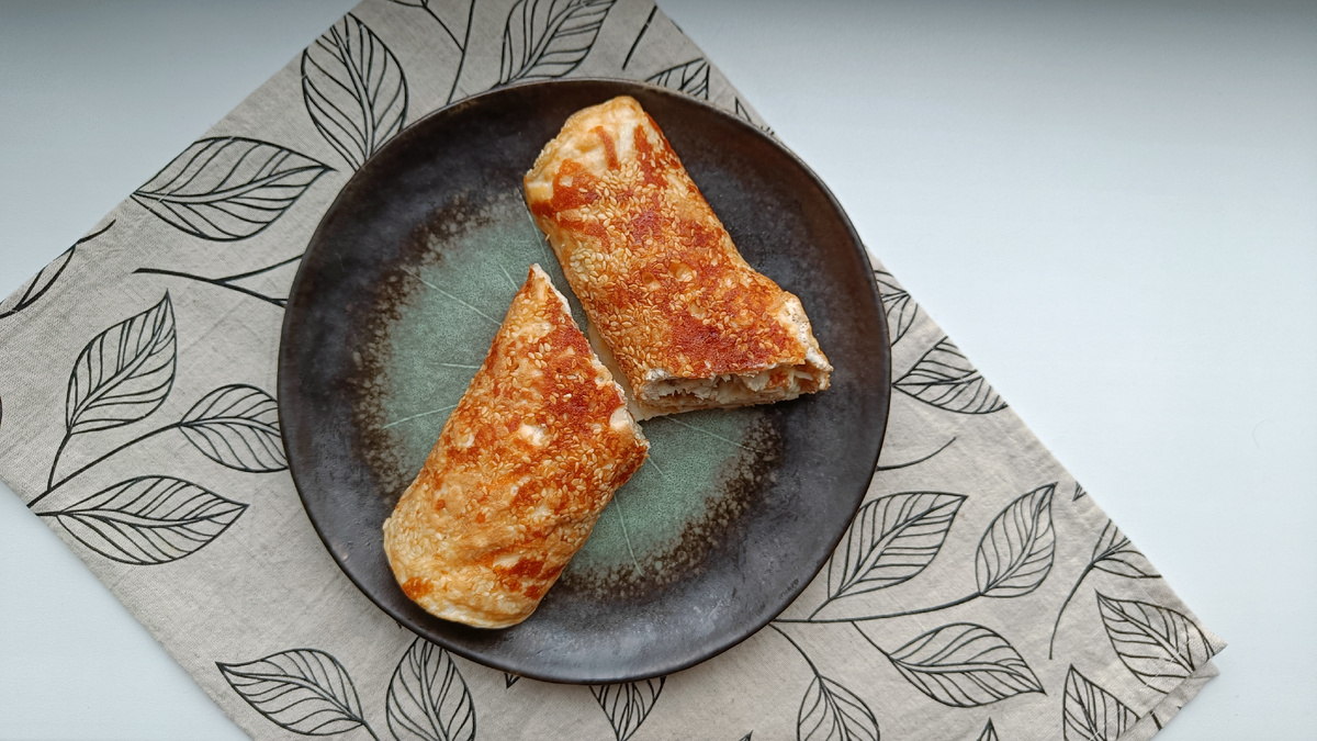Яично-кунжутный ролл с белковой начинкой станет отличным злом сбалансированного питания. Добавление свежих овощей или альтернативной выпечки сделает его еще более насыщенным и полезным!