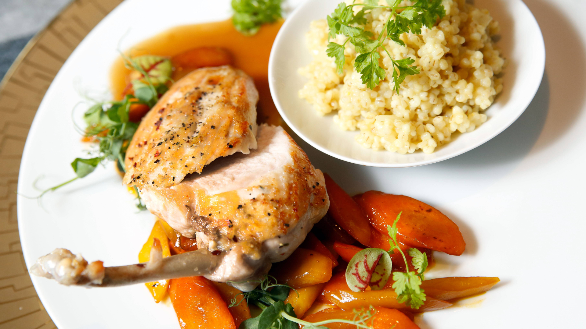 Спустя два часа обжарьте нарезанные лук и морковь и переложите в емкость для запекания. Добавьте перловку и посолите гарнир по вкусу. Сверху положите замаринованную курицу и залейте все водой, чтобы жидкость покрывала крупу.