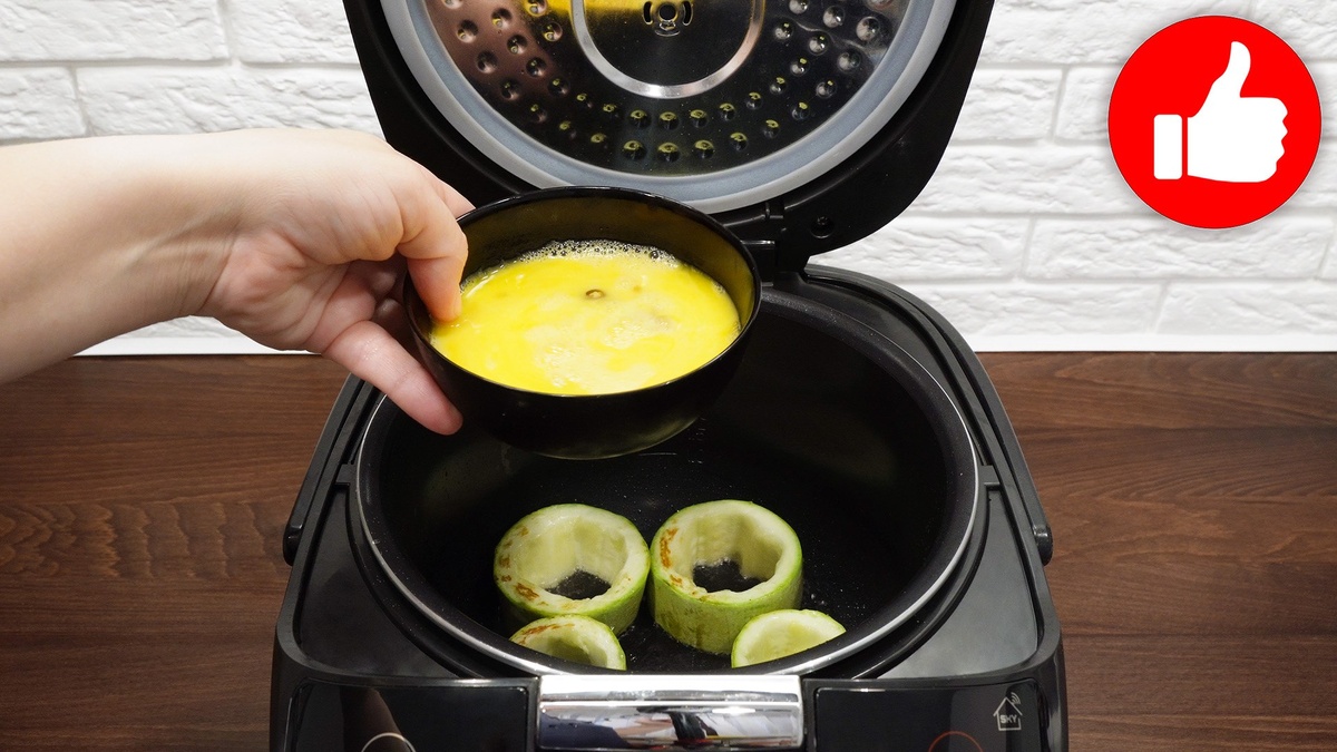 Далее, в чаше мультиварки нужно разогреть подсолнечное масло, активировав режим «Жарка». Как только масло достигнет нужной температуры, обжарьте кабачки с одной стороны в течение 2 минут. Перевернув их, аккуратно влейте яичную смесь. Закройте крышку мультиварки и дайте блюду готовиться еще 4 минуты. Затем, отключив режим «Жарка», оставьте яичницу в режиме поддержания температуры еще на 5 минут без открытия крышки.