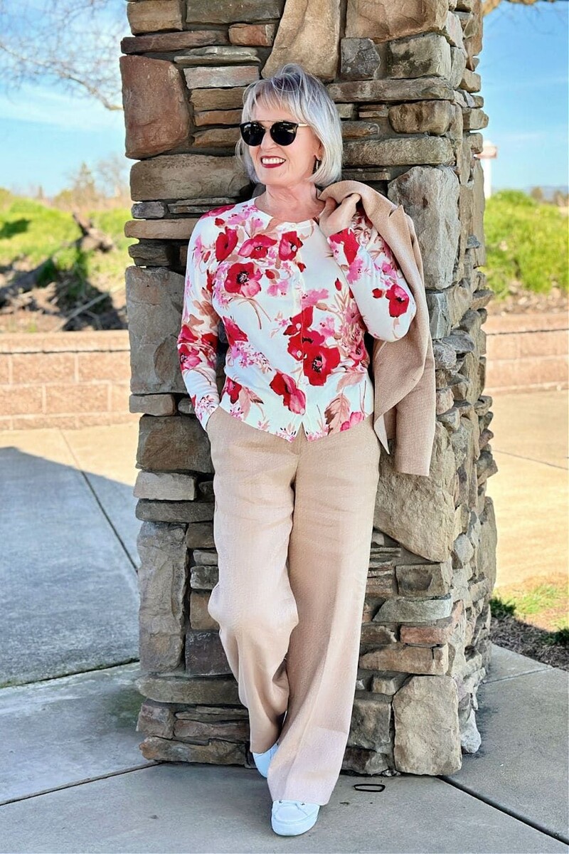 - Элегантный бежевый костюм — идеальный выбор для выходов в свет. Отлично подойдет жакет с приталенным кроем и свободные брюки. Для контраста можно добавить блузку с цветочным принтом, например, с яркими маками. Завершить образ помогут белые кроссовки и стильные темные очки.