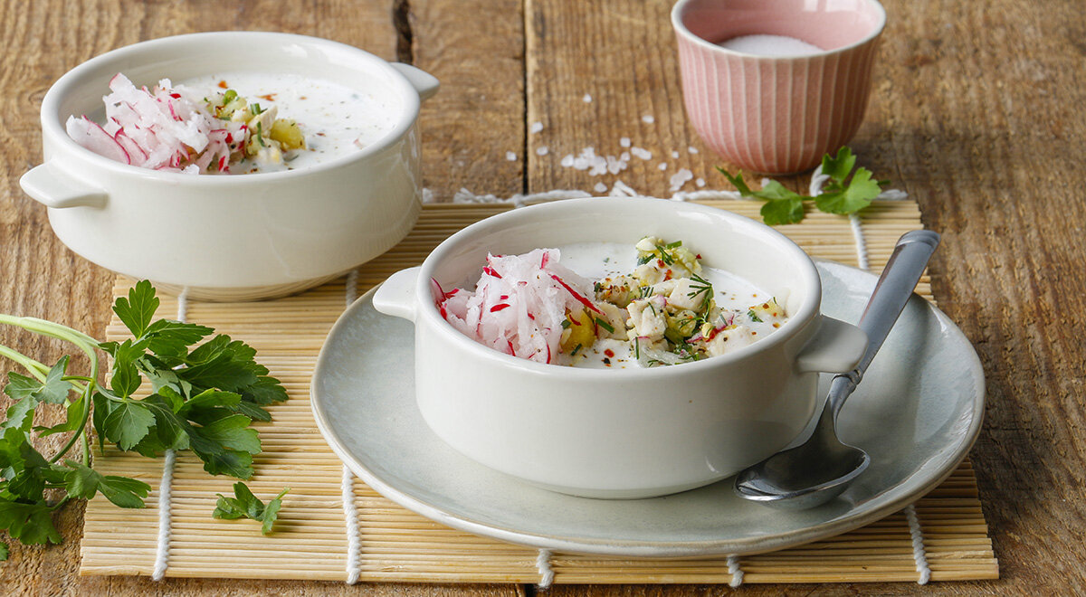 Окрошка с курицей на кефире – это «белая» версия любимого блюда, и в этой интерпретации квас был заменен на нежирный кефир. Вместо привычных ингредиентов использованы: