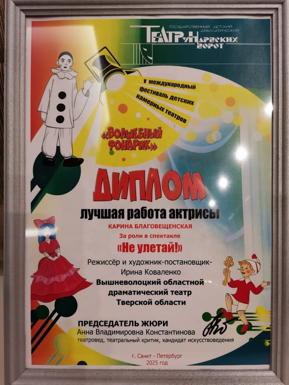 Актриса Вышневолоцкого драмтеатра Карина Благовещенская получила награду за лучшую актёрскую работу на V Международном фестивале детских камерных театров «Волшебный фонарик»