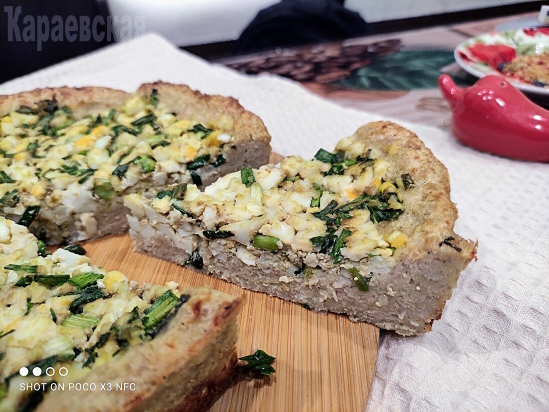 Форму для выпекания нужно заполнить куриным тестом, равномерно распределив его и придавая бортики. Далее, зеленый лук следует мелко нарезать и слегка посолить, затем смешать с нарезанными яйцами — начинка для пирога готова.