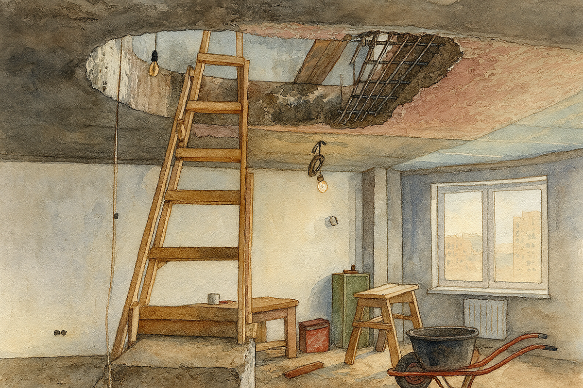 Жительница Москвы, владеющая квартирой в 25-этажном доме, заметила, что над ее жилым пространством располагается технический этаж, используемый, в том числе, под офисные нужды. Она решила взять в аренду одно из помещений этого этажа и вскоре приступила к масштабной реконструкции. Рабочие пробили в потолке проем диаметром 1,7 м, установили лестницу, создав новые комнаты с кухней и ванной.
