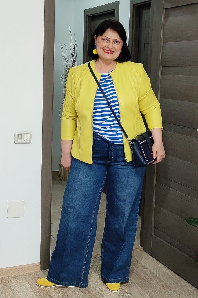 - Темно-синие джинсы: Эти универсальные джинсы подходят всем типам фигур и скрывают недостатки. Идеально дополняются «тельняшкой» с коротким рукавом и яркой желтой курткой. Яркая обувь, сумочка через плечо и крупные серьги завершают образ с изюминкой.