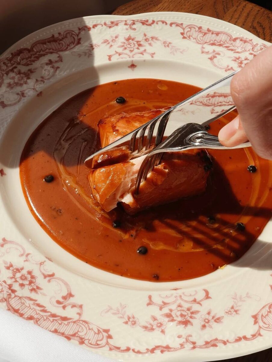 - Лосось с соусом из черного перца: Нежное филе, томленное в ароматном соусе с мягкой пикантностью черного перца, станет настоящим открытием для ценителей рыбы.